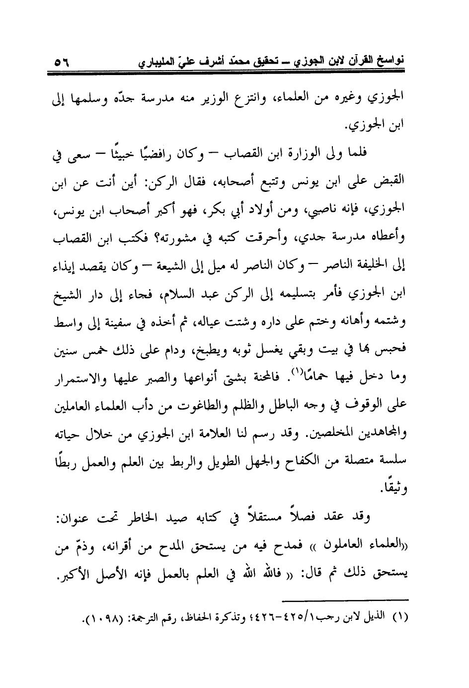 فلما ولى الوزارة ابن القصاب - وكان رافضيًا خبيثًا - سعى في القبض على ابن يونس وتتبع أصحابه، فقال الركن: أين أنت عن ابن الجوزي، فإنه ناصبي، ومن أولاد أبي بكر، فهو أكبر أصحاب ابن يونس، وأعطاه مدرسة جدي، وأحرقت كتبه في مشورته؟ فكتب ابن القصاب إلى الخليفة الناصر - وكان الناصر له ميل إلى الشيعة - وكان يقصد إيذاء ابن الجوزي فأمر بتسليمه إلى الركن عبد السلام، فجاء إلى دار الشيخ وشتمه وأهانه وختم على داره وشتت عياله، ثم أخذه في سفينة إلى واسط فحبس بها في بيت وبقي يغسل ثوبه ويطبخ، ودام على ذلك خمس سنين وما دخل فيها حمامًا1. فالمحنة بشتى أنواعها والصبر عليها والاستمرار على الوقوف في وجه الباطل والظلم والطاغوت من دأب العلماء العاملين والمجاهدين المخلصين. وقد رسم لنا العلامة ابن الجوزي من خلال حياته سلسة متصلة من الكفاح والجهل الطويل والربط بين العلم والعمل ربطًا وثيقًا.