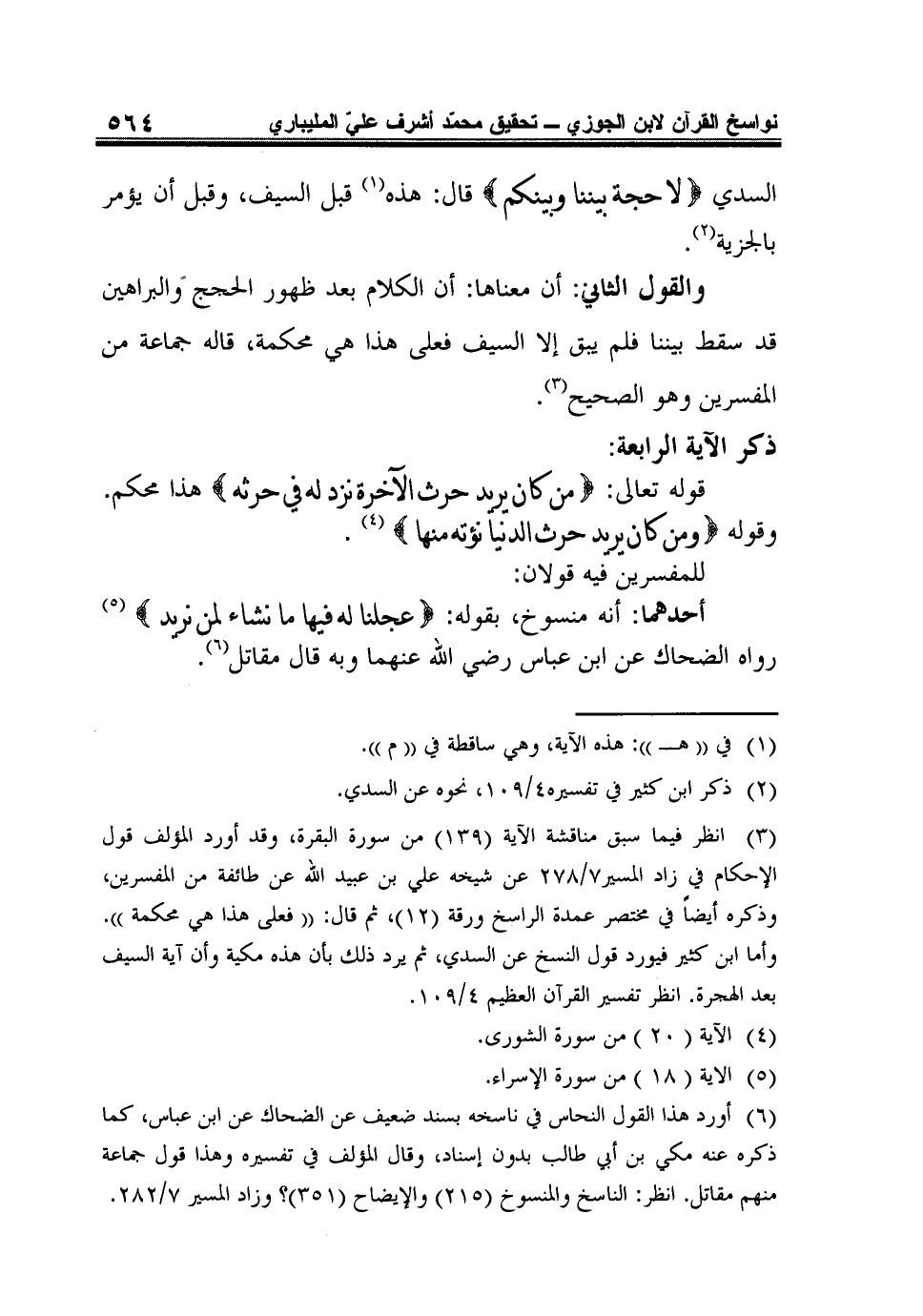3 انظر فيما سبق مناقشة الآية (139) من سورة البقرة، وقد أورد المؤلف قول الإحكام في زاد المسير7/ 278 عن شيخه علي بن عبيد الله عن طائفة من المفسرين، وذكره أيضاً في مختصر عمدة الراسخ ورقة (12)، ثم قال: (فعلى هذا هي محكمة). وأما ابن كثير فيورد قول النسخ عن السدي، ثم يرد ذلك بأن هذه مكية وأن آية السيف بعد الهجرة. انظر تفسير القرآن العظيم 4/ 109.