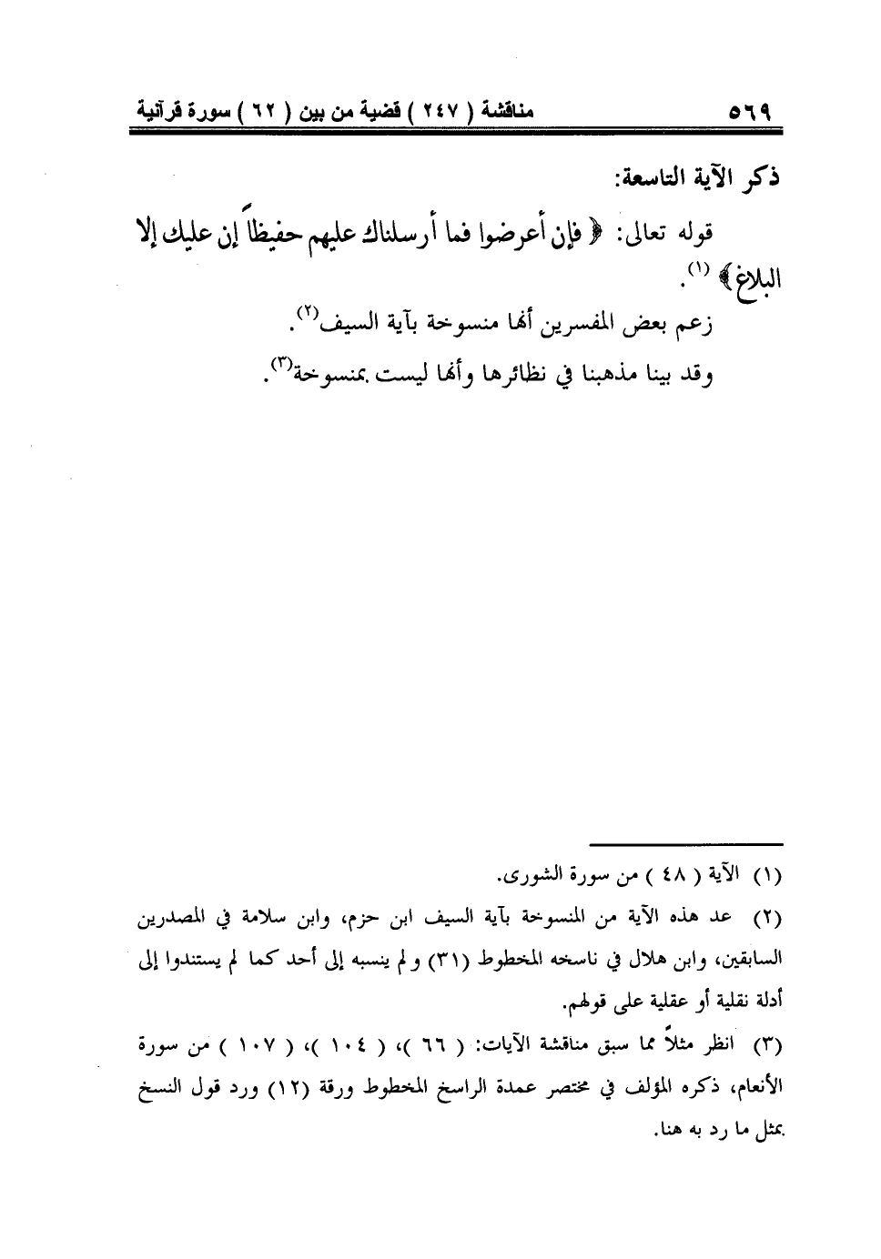 3 انظر مثلاً مما سبق مناقشة الآيات: (66)، (104)، (107) من سورة الأنعام، ذكره المؤلف في مختصر عمدة الراسخ المخطوط ورقة (12) ورد قول النسخ بمثل ما رد به هنا.