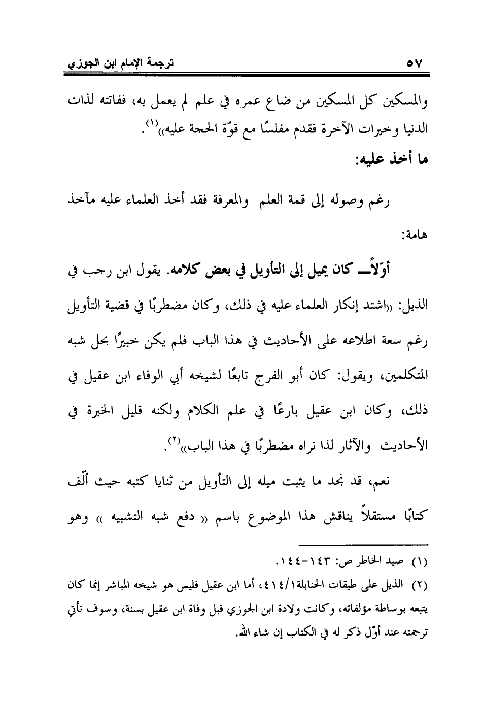 2 الذيل على طبقات الحنابلة 1/ 414, أما ابن عقيل فليس هو شيخه المباشر إنما كان يتبعه بوساطة مؤلفاته, وكانت ولادة ابن الجوزي قبل وفاة ابن عقيل بسنة, وسوف تأتي ترجمته عند أول ذكر له في الكتاب إن شاء الله.