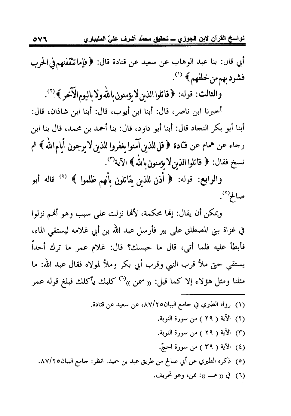 أَخْبَرَنَا ابْنُ نَاصِرٍ، قَالَ: أَبْنَا ابْنُ أَيُّوبَ، قَالَ: أَبْنَا ابْنُ شَاذَانَ، قَالَ: أَبْنَا أَبُو بَكْرٍ النَّجَّادُ قَالَ: أَبْنَا أَبُو دَاوُدَ، قال: بنا أحمد بن محمد، قال بنا ابْنُ رَجَاءٍ عَنْ هَمَّامٍ عَنْ قَتَادَةَ {قُلْ لِلَّذِينَ آمَنُوا يَغْفِرُوا لِلَّذِينَ لا يَرْجُونَ أَيَّامَ اللَّهِ} ثُمَّ نُسِخَ فَقَالَ: {قَاتِلُوا الَّذِينَ لا يُؤْمِنُونَ بِاللَّهِ} الآية3.