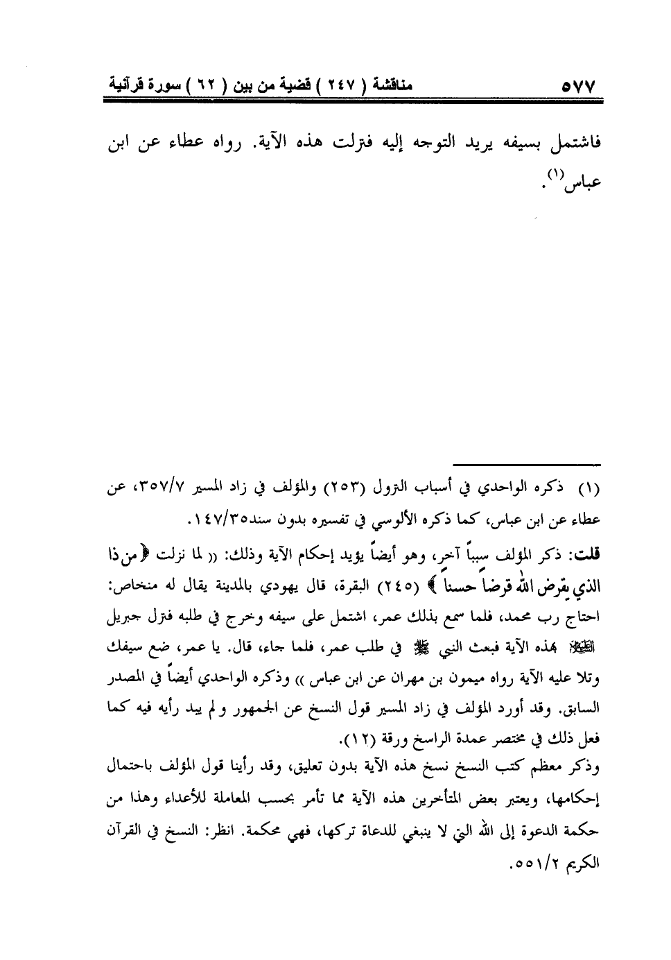 قلت: ذكر المؤلف سبباً آخر، وهو أيضاً يؤيد إحكام الآية وذلك: (لما نزلت {مَنْ ذَا الَّذِي يُقْرِضُ اللَّهَ قَرْضاً حَسَناً} (245) البقرة، قال يهودي بالمدينة يقال له منخاص: احتاج رب محمد، فلما سمع بذلك عمر، اشتمل على سيفه وخرج في طلبه فنزل جبريل عليه السلام بهذه الآية فبعث النبي صلى الله عليه وسلم في طلب عمر، فلما جاء، قال. يا عمر، ضع سيفك وتلا عليه الآية رواه ميمون بن مهران عن ابن عباس) وذكره الواحدي أيضاً في المصدر السابق. وقد أورد المؤلف في زاد المسير قول النسخ عن الجمهور ولم يبد رأيه فيه كما فعل ذلك في مختصر عمدة الراسخ ورقة (12).