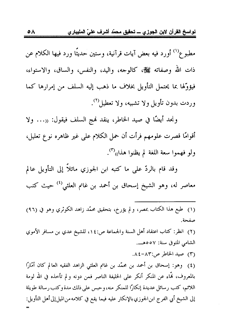 وقد قام بالردّ على ما كتبه ابن الجوزي مائلاً إلى التأويل عالم معاصر له، وهو الشيخ إسحاق بن أحمد بن غانم العلثي3 حيث كتب