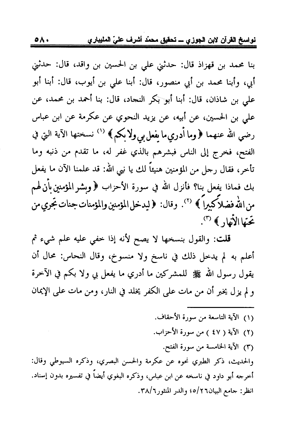 بنا محمد بن قهزاذ قَالَ: حَدَّثَنِي عَلِيُّ بْنُ الْحُسَيْنِ بْنِ وَاقِدٍ، قَالَ: حَدَّثَنِي أَبِي، وَأَبْنَا مُحَمَّدُ بْنُ أَبِي مَنْصُورٍ، قَالَ: أَبْنَا عَلِيُّ بْنُ أَيُّوبَ، قَالَ: أَبْنَا أَبُو عَلِيِّ بْنُ شَاذَانَ، قَالَ: أَبْنَا أَبُو بَكْرٍ النجاد، قال: بنا أَحْمَدُ بْنُ مُحَمَّدٍ، عَنْ عَلِيِّ بْنُ الْحُسَيْنِ، عَنْ أَبِيهِ، عَنْ يَزِيدَ النَّحْوِيِّ عَنْ عِكْرِمَةَ عَنِ ابْنِ عَبَّاسٍ رَضِيَ اللَّهُ عَنْهُمَا {وَمَا أَدْرِي مَا يُفْعَلُ بِي} 1 نَسَخَتْهَا الآيَةُ الَّتِي فِي الْفَتْحِ، فَخَرَجَ إِلَى النَّاسِ فَبَشَرَّهُمْ بِالَّذِي غفر له، ما تَقَدَّمَ مِنْ ذَنْبِهِ وَمَا تَأَخَّرَ، فقال رَجُلٌ مِنَ الْمُؤْمِنِينَ هَنِيئًا لَكَ يَا نَبِيَّ اللَّهِ: قَدْ عَلِمْنَا الآنَ مَا يُفْعَلُ بِكَ فَمَاذَا يُفْعَلُ بِنَا؟ فَأَنْزَلَ اللَّهُ فِي سُورَةِ الأَحْزَابِ {وَبَشِّرِ الْمُؤْمِنِينَ بِأَنَّ لَهُمْ مِنَ اللَّهِ فَضْلاً كَبِيراً} 2. وَقَالَ: {لِيُدْخِلَ الْمُؤْمِنِينَ وَالْمُؤْمِنَاتِ جَنَّاتٍ تَجْرِي مِنْ تَحْتِهَا الآنْهَارُ} 3.