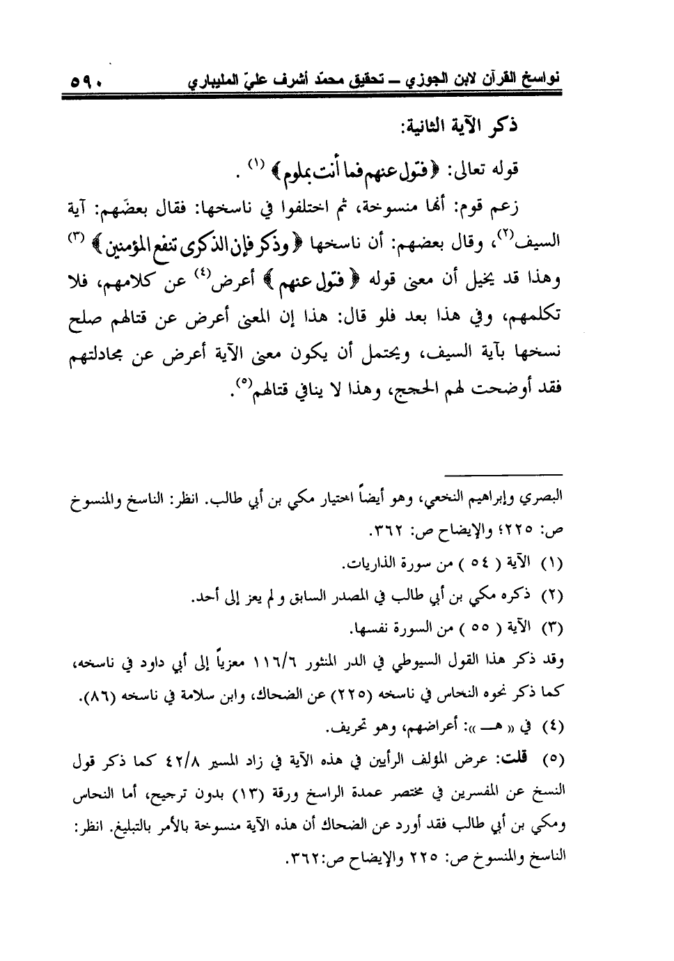 زَعَمَ قَوْمٌ: أَنَّهَا مَنْسُوخَةٌ، ثُمَّ اخْتَلَفُوا فِي نَاسِخِهَا: فَقَالَ بَعْضُهُمْ: آيَةُ السَّيْفِ2، وَقَالَ بَعْضُهُمْ: إِنَّ نَاسِخَهَا {وَذَكِّرْ فَإِنَّ الذِّكْرَى تَنْفَعُ الْمُؤْمِنِينَ} 3 وَهَذَا قَدْ يُخَيِّلُ أَنَّ مَعْنَى قوله {فَتَوَلَّ عَنْهُمْ} أَعْرِضْ4 عَنْ كَلامِهِمْ، فَلا تُكَلِّمْهُمْ، وَفِي هَذَا بُعْدٌ فَلَوْ قَالَ: هَذَا إِنَّ الْمَعْنَى أَعْرِضْ عَنْ قِتَالِهِمْ صَلُحَ نَسْخُهَا بِآيَةِ السَّيْفِ، وَيُحْتَمَلُ أَنْ يَكُونَ مَعْنَى الآيَةِ أَعْرِضْ عَنْ مُجَادَلَتِهِمْ فَقَدْ أَوْضَحْتَ لَهُمُ الْحِجِجَ، وَهَذَا لا يُنَافِي قتالهم5.