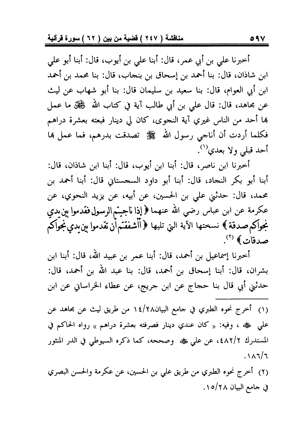 أَخْبَرَنَا ابْنُ نَاصِرٍ، قَالَ: أَبْنَا ابْنُ أَيُّوبَ، قَالَ: أَبْنَا ابْنُ شَاذَانَ، قَالَ: أَبْنَا أَبُو بَكْرٍ النَّجَّادُ، قَالَ: أَبْنَا أَبُو دَاوُدَ السِّجِسْتَانِيُّ قَالَ: أَبْنَا أَحْمَدُ بْنُ مُحَمَّدٍ، قَالَ: حَدَّثَنِي عَلِيُّ بْنُ الْحُسَيْنِ، عَنْ أَبِيهِ، عَنْ يَزِيدَ النَّحْوِيِّ، عَنْ عِكْرِمَةَ عَنِ ابْنِ عَبَّاسٍ رَضِيَ اللَّهُ عَنْهُمَا {إِذَا نَاجَيْتُمُ الرَّسُولَ فَقَدِّمُوا بَيْنَ يَدَيْ نَجْوَاكُمْ صَدَقَة} نسختها الآية التي تليها {أَأَشْفَقْتُمْ أَنْ تُقَدِّمُوا بَيْنَ يَدَيْ نَجْوَاكُمْ صَدَقَاتٍ} 2.