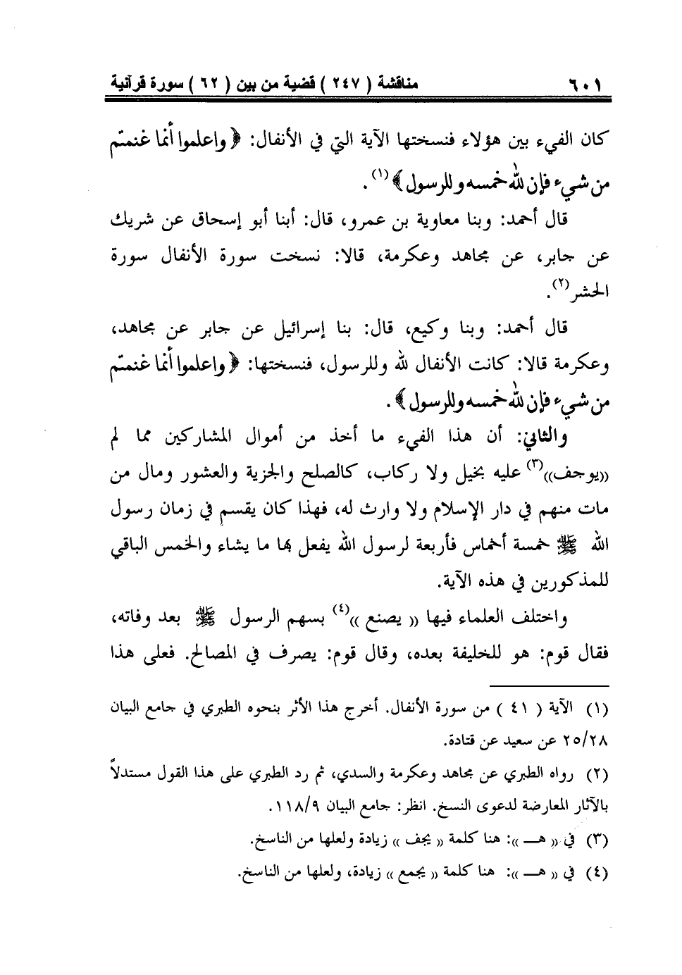 قال أحمد: وبنا مُعَاوِيَةُ بْنُ عَمْرٍو، قَالَ: أَبْنَا أَبُو إِسْحَاقَ عَنْ شَرِيكٍ عَنْ جَابِرٍ، عَنْ مُجَاهِدٍ وَعِكْرِمَةَ، قَالا: نَسَخَتْ سُورَةُ الأَنْفَالِ سُورَةَ الْحَشْرِ2.