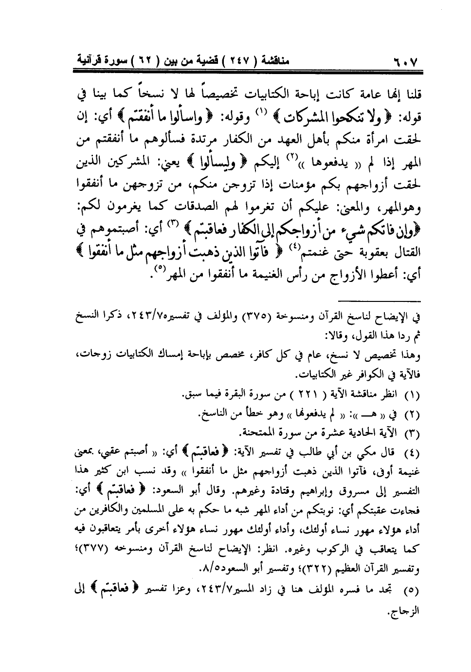 قُلْنَا إِنَّهَا عَامَّةٌ كَانَتْ إِبَاحَةُ الْكِتَابِيَّاتِ تَخْصِيصًا لَهَا لا نَسْخًا كَمَا بَيَّنَّا فِي قَوْلِهِ: {وَلا تَنْكِحُوا الْمُشْرِكَات} 1 وقوله: {وَاسْأَلُوا مَا أَنْفَقْتُمْ} أَيْ: إِنْ لَحِقَتِ امْرَأَةٌ مِنْكُمْ بِأَهْلِ الْعَهْدِ مِنَ الْكُفَّارِ مُرْتَدَّةً فسألوهم مَا أَنْفَقْتُمْ مِنَ الْمَهْرِ إِذَا لم (يدفعوها) 2 إليكم {وَلْيَسْأَلوا} يَعْنِي: الْمُشْرِكِينَ الذَّينَ لَحِقَتْ أَزْوَاجُهُمْ بِكُمْ مُؤْمِنَاتٍ إِذَا تَزَوَّجْنَ مِنْكُمْ، من تزوجهن ما أنفقوا وهوالمهر، وَالْمَعْنَى: عَلَيْكُمْ أَنْ تَغْرَمُوا لَهُمُ الصَّدَقَاتِ كَمَا يَغْرَمُونَ لَكُمْ: {وَإِنْ فَاتَكُمْ شَيْءٌ مِنْ أَزْوَاجِكُمْ إِلَى الْكُفَّارِ فَعَاقَبْتُمْ} 3 أَيْ: أَصَبْتُمُوهُمْ فِي الْقِتَالِ بِعُقُوبَةٍ حَتَّى غَنِمْتُمْ4 {فَآتُوا الَّذِينَ ذَهَبَتْ أَزْوَاجُهُمْ مِثْلَ مَا أَنْفَقُوا} أَيْ: أَعْطُوا الأَزْوَاجَ مِنْ رَأْسِ الْغَنِيمَةِ مَا أَنْفَقُوا مِنَ الْمَهْرِ5.