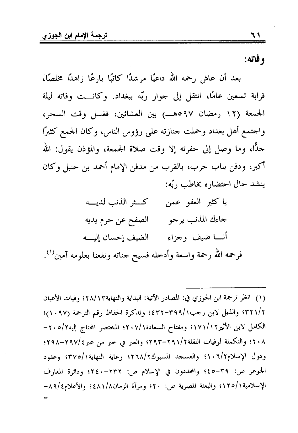 1 انظر ترجمة ابن الجوزي في: المصادر الآتية: البداية والنهاية 13/ 28؛ وفيلت الأعيان 2/ 321؛ والذيل لابن رجب 1/ 399 - 432؛ وتذكرة الحفاظ رقم الترجمة (1097)؛ الكامل لابن الأثير 12/ 171؛ ومفتاح السعادة1/ 207؛ المختصر المحتاج إليه 2/ 205 - 208؛ والتكملة لوفيات النقلة 2/ 291 - 293؛ والعبر في خبر من عبر 4/ 297 - 298؛ ودول الإسلام 2/ 106؛ والعسجد المسبوك 2/ 268؛ وغاية النهاية 1/ 375؛ وعقود الجوهر ص: 39 - 45؛ والمجددون في الإسلام ص: 232 - 240؛ ودائرة المعارف الإسلامية 1/ 125؛ والبعثة المصرية ص: 20؛ ومرة الزمان 8/ 481؛ والأعلام 4/ 89 - 90؛ ومعجم المؤلفين 5/ 157 - 158؛ ومرآة الجنان 3/ 489 - 492؛ والمشيخة للنعال (140)؛ وابن الوردي 2/ 118.