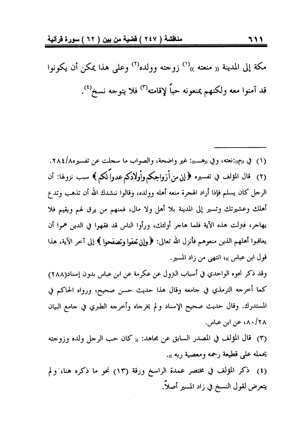 4 ذكر المؤلف في مختصر عمدة الراسخ ورقة (13) نحو ما ذكره هنا، ولم يتعرض لقول النسخ في زاد المسير أصلاً.