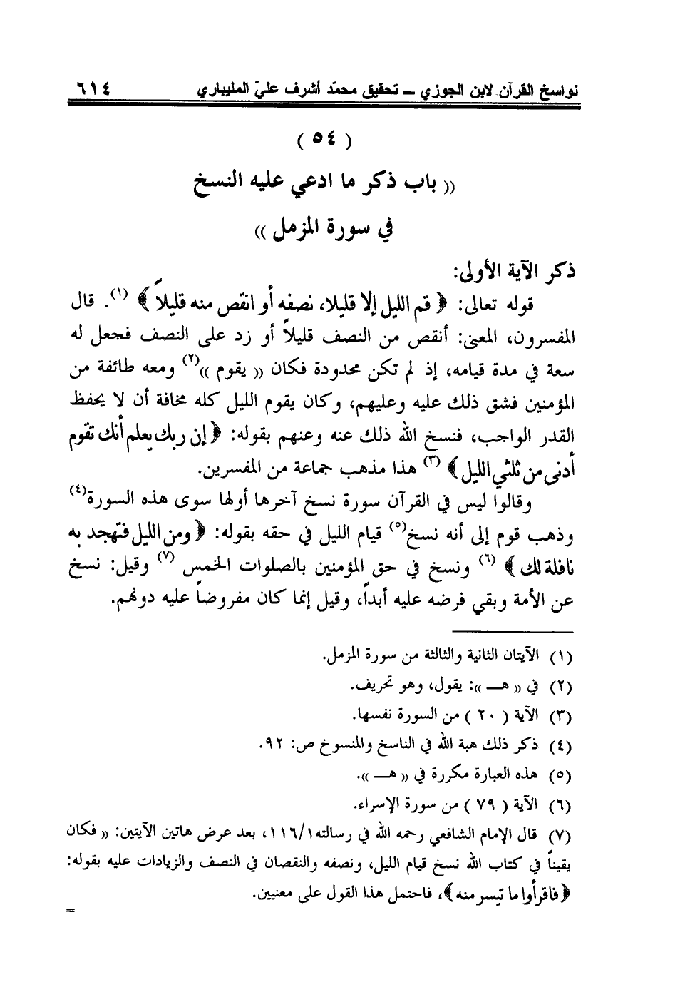 ذِكْرُ الآيَةِ الأُولَى: قَوْلُهُ تَعَالَى: {قُمِ اللَّيْلَ إِلاّ قَلِيلاً، نِصْفَهُ أَوِ انْقُصْ مِنْهُ قَلِيلاً} 1. قَالَ الْمُفَسِّرُونَ، الْمَعْنَى: انْقُصْ مِنَ النِّصْفِ قَلِيلا أَوْ زِدْ عَلَى النِّصْفِ فَجُعِلَ لَهُ سَعَةً فِي مُدَّةِ قِيَامِهِ، إِذْ لَمْ تَكُنْ مَحْدُودَةً فَكَانَ (يَقُومُ) 2 وَمَعَهُ طَائِفَةٌ مِنَ الْمُؤْمِنِينَ فَشَقَّ ذَلِكَ عَلَيْهِ وَعَلَيْهِمْ، وَكَانَ يَقُومُ اللَّيْلَ كُلَّهُ مَخَافَةَ أَنْ لا يَحْفَظَ الْقَدْرَ الْوَاجِبَ، فَنَسَخَ اللَّهُ ذَلِكَ عَنْهُ وَعَنْهُمْ بِقَوْلِهِ: {إِنَّ رَبَّكَ يَعْلَمُ أَنَّكَ تَقُومُ أَدْنَى مِنْ ثُلُثَيِ اللَّيْلِ} 3 هَذَا مَذْهَبُ جَمَاعَةٍ مِنَ الْمُفَسِّرِينَ.