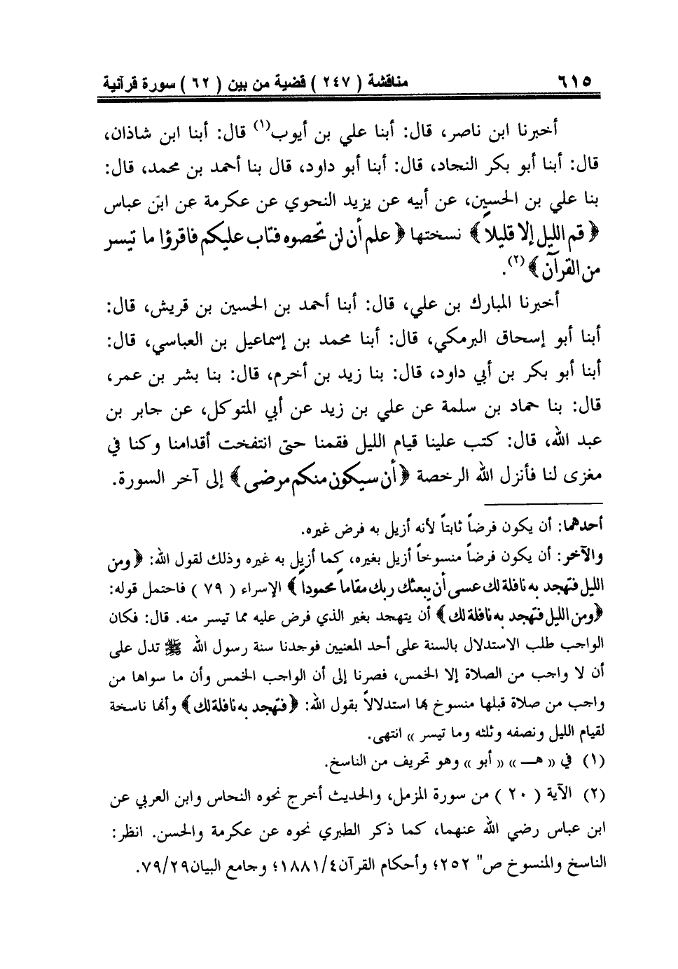أَخْبَرَنَا ابْنُ نَاصِرٍ، قَالَ: أَبْنَا عَلِيُّ بْنُ أَيُّوبَ1 قَالَ: أَبْنَا ابْنُ شَاذَانَ، قَالَ: أَبْنَا أَبُو بَكْرٍ النَّجَّادُ، قَالَ: أَبْنَا أَبُو داود، قال بنا أحمد بن محمد، قال: بنا عَلِيُّ بْنُ الْحُسَيْنِ، عَنْ أَبِيهِ عَنْ يَزِيدَ النَّحْوِيِّ عَنْ عِكْرِمَةَ عَنِ ابْنِ عَبَّاسٍ {قُمِ اللَّيْلَ إِلاّ قَلِيلاً} نَسَخَتْهَا {عَلِمَ أَنْ لَنْ تُحْصُوهُ فَتَابَ عَلَيْكُمْ فَاقْرَأُوا مَا تَيَسَّرَ مِنَ الْقُرْآنِ} 2.
