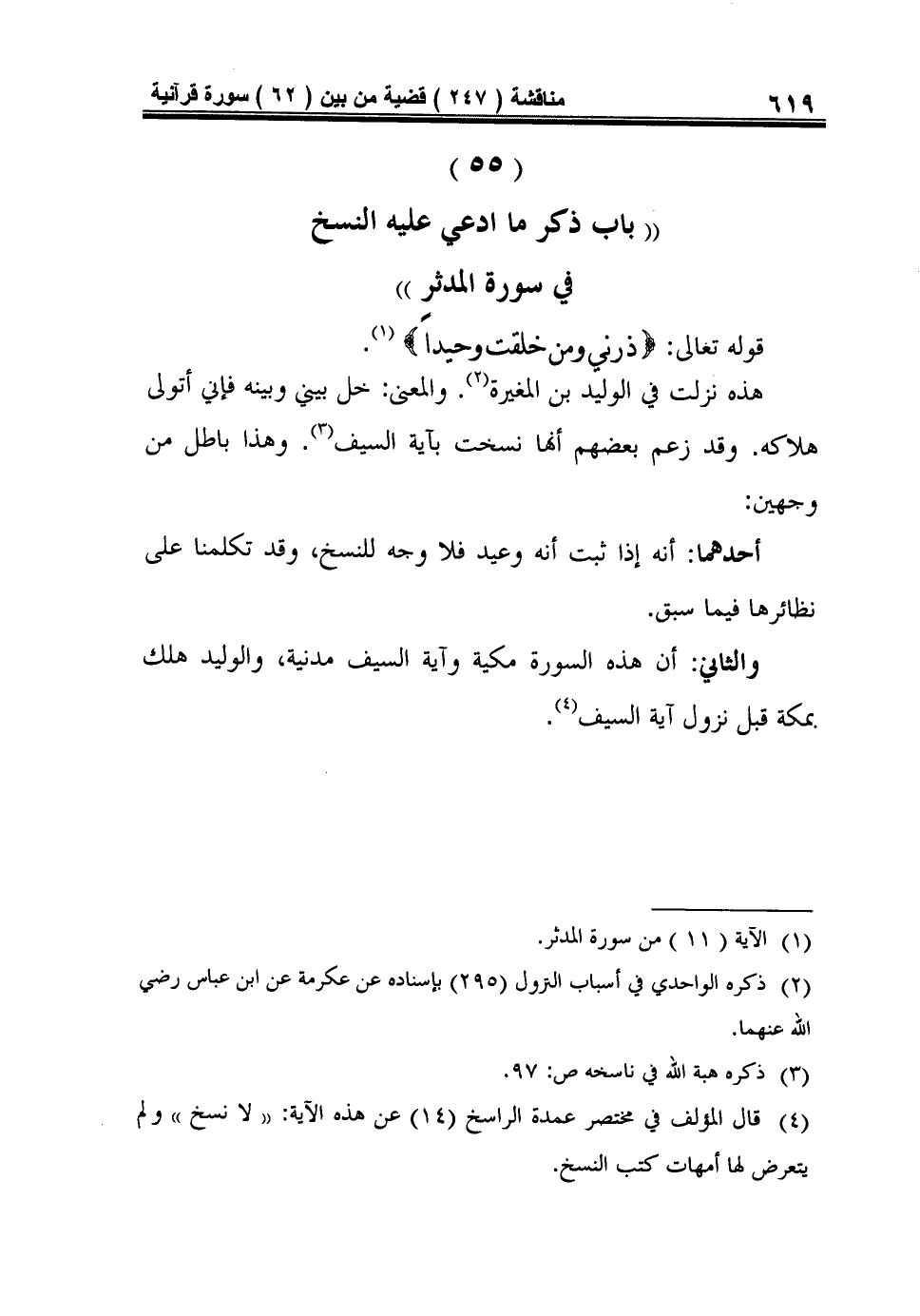 4 قال المؤلف في مختصر عمدة الراسخ (14) عن هذه الآية: (لا نسخ) ولم يتعرض لها أمهات كتب النَّسْخُ.