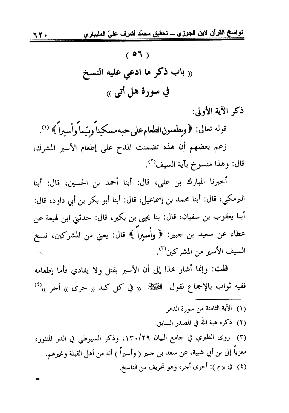 3 روى الطبري في جامع البيان 29/ 130، وذكر السيوطي في الدر المنثور، معزياً إلى بن أبي شيبة، عن سعد بن جبير (وأسيراً) أنه من أهل القبلة وغيرهم.
