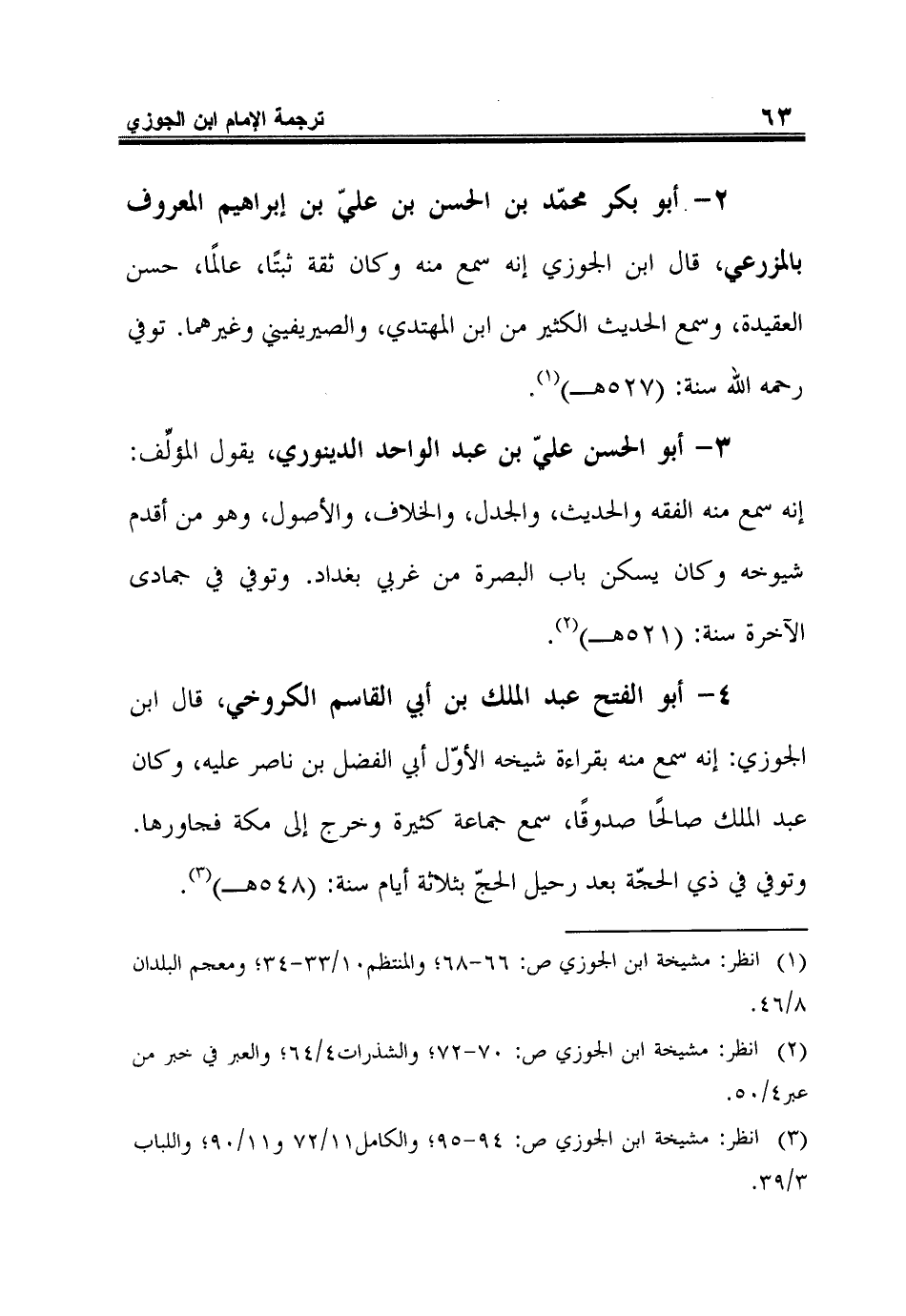 4 - أبو الفتح عبد الملك بن أبي القاسم الكروخي، قال ابن الجوزي: إنه سمع منه بقراءة شيخه الأوّل أبي الفضل بن ناصر عليه، وكان عبد الملك صالحًا صدوقًا، سمع جماعة كثيرة وخرج إلى مكة فجاورها. وتوفي في ذي الحجّة بعد رحيل الحجّ بثلاثة أيام سنة: (548هـ).