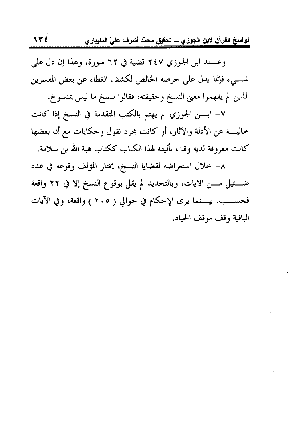 8 - خلال استعراضه لقضايا النسخ، يختار المؤلف وقوعه في عدد ضئيل من الآيات، وبالتحديد لم يقل بوقوع النسخ إلا في 22 واقعة فحسب. بينما يرى الإحكام في حوالي (205) واقعة، وفي الآيات الباقية وقف موقف الحياد.