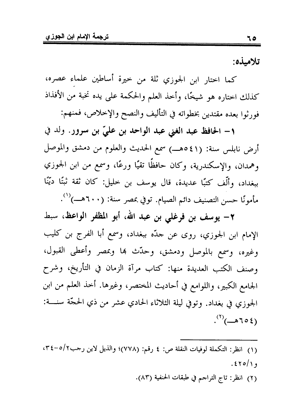 2 - يوسف بن فرغلي بن عبد الله، أبو المظفر الواعظ، سبط الإمام ابن الجوزي، روى عن جدّه ببغداد، وسمع أبا الفرج بن كليب وغيره، وسمع بالموصل ودمشق، وحدّث بها وبمصر وأعطى القبول، وصنف الكتب العديدة منها: كتاب مرآة الزمان في التأريخ، وشرح الجامع الكبير، واللوامع في أحاديث المختصر، وغيرها. أخذ العلم من ابن الجوزي في بغداد. وتوفي ليلة الثلاثاء الحادي عشر من ذي الحجّة سنة: (654هـ).