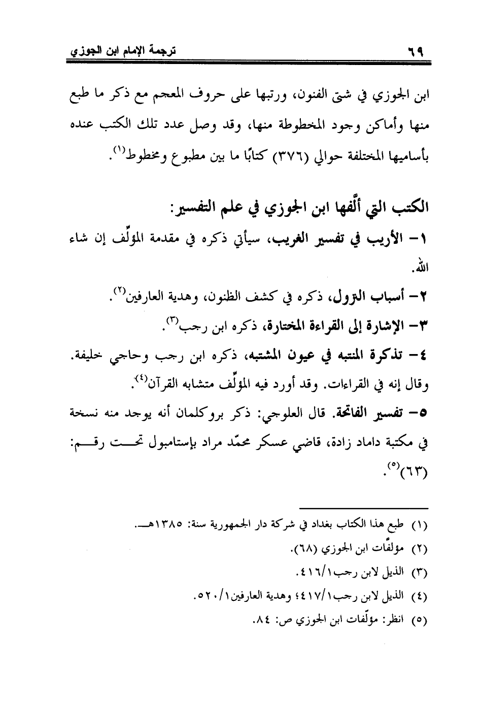ابن الجوزي في شتى الفنون، ورتبها على حروف المعجم مع ذكر ما طبع منها وأماكن وجود المخطوطة منها، وقد وصل عدد تلك الكتب عنده بأساميها المختلفة حوالي (376) كتابًا ما بين مطبوع ومخطوط.