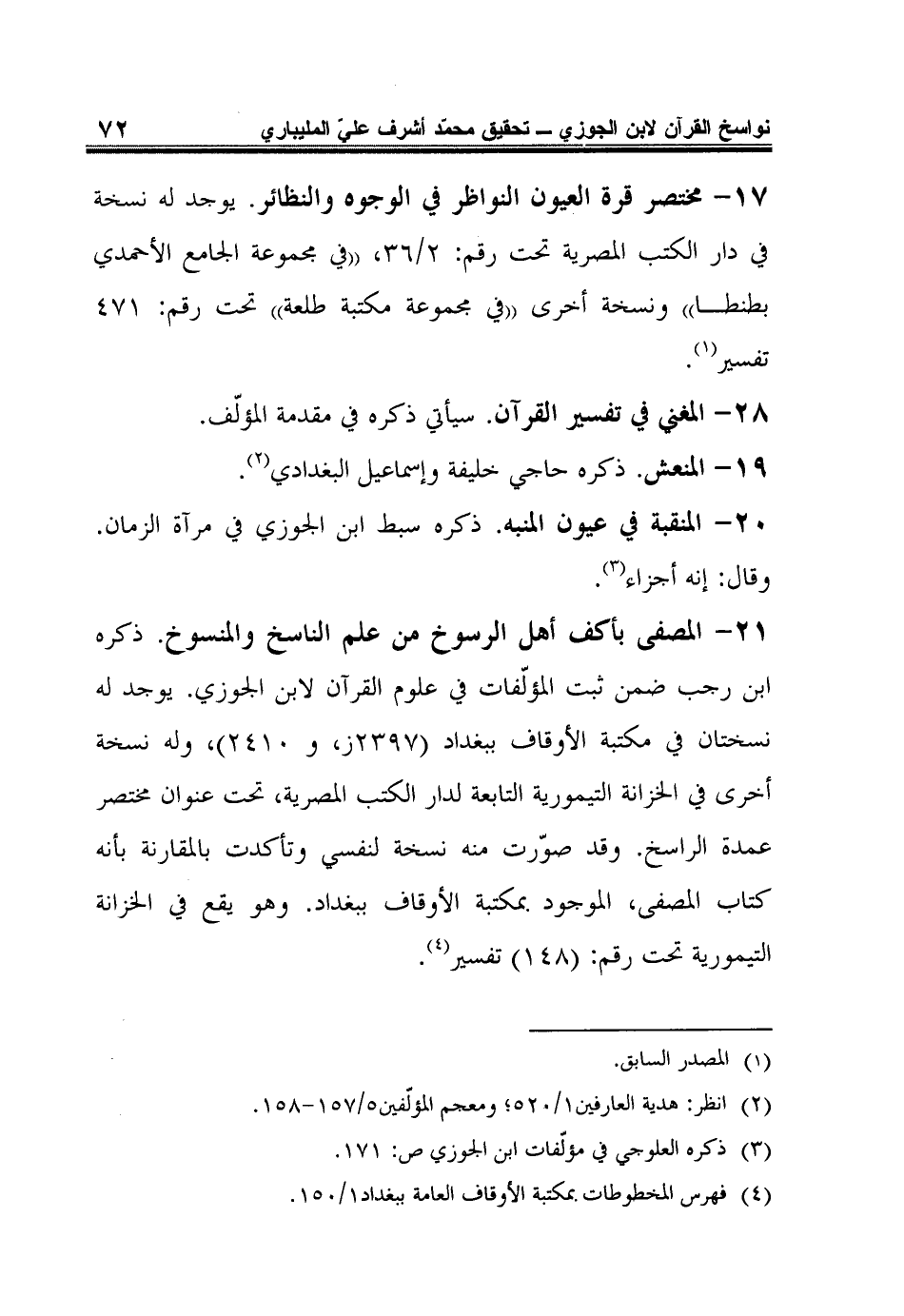 21 - المصفى بأكف أهل الرسوخ من علم الناسخ والمنسوخ. ذكره ابن رجب ضمن ثبت المؤلّفات في علوم القرآن لابن الجوزي. يوجد له نسختان في مكتبة الأوقاف ببغداد (2397ز، و 2410)، وله نسخة أخرى في الخزانة التيمورية التابعة لدار الكتب المصرية، تحت عنوان مختصر عمدة الراسخ. وقد صوّرت منه نسخة لنفسي وتأكدت بالمقارنة بأنه كتاب المصفى، الموجود بمكتبة الأوقاف ببغداد. وهو يقع في الخزانة التيمورية تحت رقم: (148) تفسير.