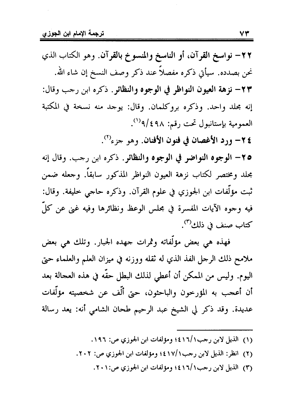 23 - نزهة العيون النواظر في الوجوه والنظائر. ذكره ابن رجب وقال: إنه مجلد واحد. وذكره بروكلمان. وقال: يوجد منه نسخة في المكتبة العمومية بإستانبول تحت رقم: 498/ 9.