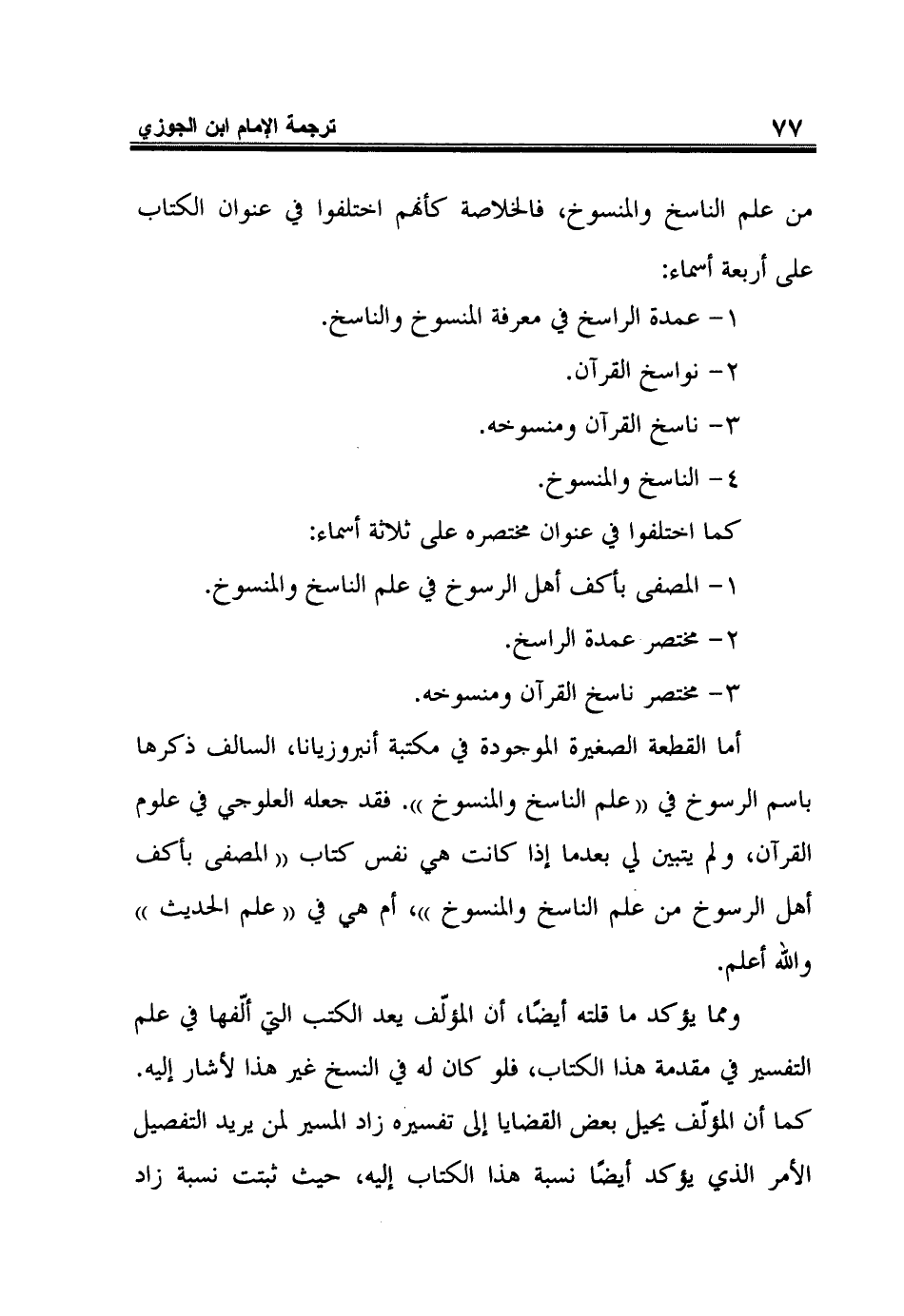 أما القطعة الصغيرة الموجودة في مكتبة أنبروزيانا، السالف ذكرها باسم الرسوخ في (علم الناسخ والمنسوخ). فقد جعله العلوجي في علوم القرآن، ولم يتبين لي بعدما إذا كانت هي نفس كتاب (المصفى بأكف أهل الرسوخ من علم الناسخ والمنسوخ)، أم هي في (علم الحديث) والله أعلم.