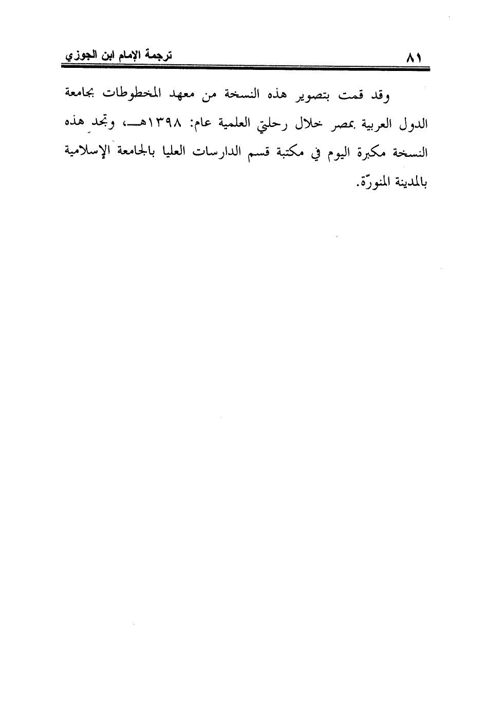 وقد قمت بتصوير هذه النسخة من معهد المخطوطات بجامعة الدول العربية بمصر خلال رحلتي العلمية عام: 1398هـ، وتجد هذه النسخة مكبرة اليوم في مكتبة قسم الدارسات العليا بالجامعة الإسلامية بالمدينة المنورّة.