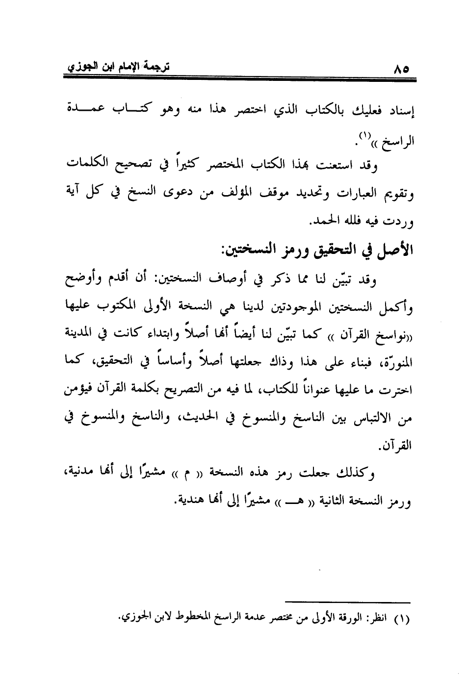 وقد تبيّن لنا مما ذكر في أوصاف النسختين: أن أقدم وأوضح وأكمل النسختين الموجودتين لدينا هي النسخة الأولى المكتوب عليها (نواسخ القرآن) كما تبيّن لنا أيضاً أنها أصلاً وابتداء كانت في المدينة المنورّة، فبناء على هذا وذاك جعلتها أصلاً وأساساً في التحقيق، كما اخترت ما عليها عنواناً للكتاب، لما فيه من التصريح بكلمة القرآن فيؤمن من الالتباس بين الناسخ والمنسوخ في الحديث، والناسخ والمنسوخ في القرآن.