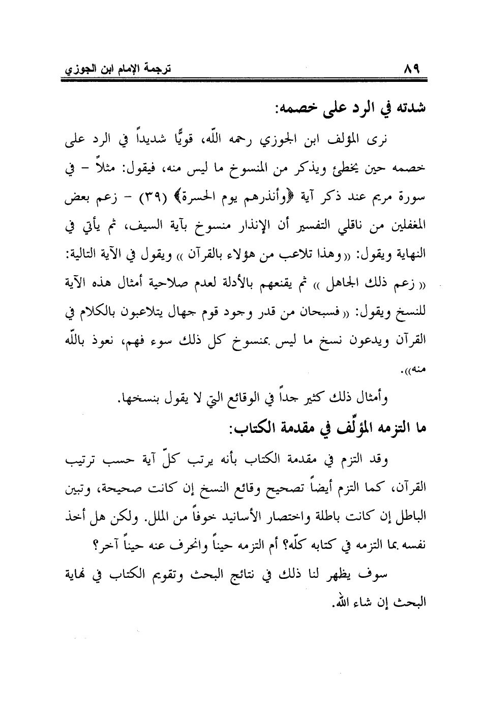 نرى المؤلف ابن الجوزي رحمه الله، قويًّا شديداً في الرد على خصمه حين يخطئ ويذكر من المنسوخ ما ليس منه، فيقول: مثلاً - في سورة مريم عند ذكر آية {وَأَنْذِرْهُمْ يَوْمَ الْحَسْرَةِ} (39) "زَعَمَ بَعْضُ الْمُغَفَّلِينَ مِنْ نَاقِلِي التَّفْسِيرِ أَنَّ الإِنْذَارَ مَنْسُوخٌ بِآيَةِ السيف"، ثم يأتي في النهاية ويقول: "وَهَذَا تَلاعُبٌ مِنْ هَؤُلاءِ بِالْقُرْآنِ" ويقول في الآية التالية: "زعم ذلك الجاهل" ثم يقنعهم بالأدلة لعدم صلاحية أمثال هذه الآية للنسخ ويقول: "فَسُبْحَانَ مَنْ قَدَّرَ وُجُودَ قَوْمٍ جُهَّالٍ يَتَلاعَبُونَ بِالْكَلامِ فِي الْقُرْآنِ ويدعون نسخ ما ليس بمنسوخ كل ذلك سوء فهم، نعوذ بالله منه".