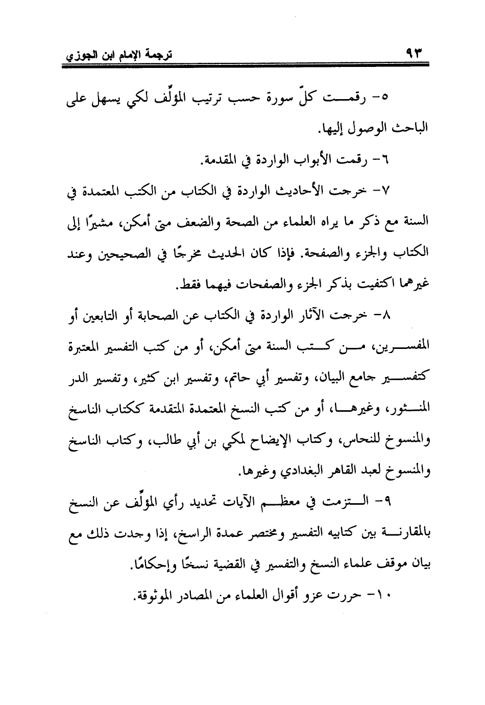 9 - التزمت في معظم الآيات تحديد رأي المؤلِّف عن النسخ بالمقارنة بين كتابيه التفسير ومختصر عمدة الراسخ، إذا وجدت ذلك مع بيان موقف علماء النسخ والتفسير في القضية نسخًا وإحكامًا.