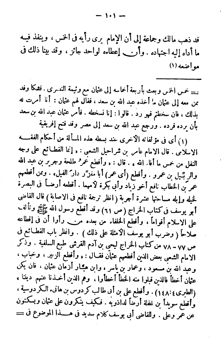 (¬1) أي في مؤلفاته الأخرى عند بسطه هذه المسألة من أحكام الفقه الإسلامي قال الإمام عامر بن شراحيل الشعبي: " إنما القطائع على وجه النفل من خمس ما أفاء الله " قال: " وأقطع عمر طلحة وجرير بن عبد الله والربيِّل بن عمرو. وأقطع (أي عمر) أبا مفزِّر دار الفيل ". وممن أقطعهم عمر بن الخطاب نافع أخو زياد وأبي بكرة لأمهما، أقطعه أرضا في البصرة لخيله وإبله مساحتها عشرة أجربة (انظر ترجمة نافع في الإصابة) قال القاضي أبو يوسف في كتاب الخراج (ص61) وقد أقطع رسول الله صلى الله عليه وسلم وتألف على الإسلام أقواما، وأقطع الخلفاء من بعده من رأوا أن في إقطاعه صلاحا (وضرب أبو يوسف الأمثلة على ذلك) . وانظر باب القطائع في ص77 - 78 من كتاب الخراج ليحيى بن آدم القرشي طبع السلفية. وذكر الإمام الشعبي بعض الذين أقطعهم عثمان فقال: " وأقطع الزبير، وخباب، وعبد الله بن مسعود، وعمار بن ياسر، وابن هبّار أزمان عثمان، فإن يكن عثمان أخطأ فالذين قبلوا منه الخطأ أخطأوا، وهم الذين أخذنا عنهم ديننا " (الطبري 4: 148) . وأقطع علي بن أبي طالب كردوس بن هانئ الكردوسية، وأقطع سويد بن غفلة أرضا لداذويه. فكيف ينكرون على عثمان ويسكتون عن عمر وعلي. وللقاضي أبي يوسف كلام سديد في هذا الموضوع في كتاب الخراج (ص60 - 62 السلفية سنة 1352) ، وما زعمه الزاعمون من أن عثمان كان يود ذوي قرابته ويعطيهم، فمودته ذوي قرابته من فضائله، وعلي أثنى على عثمان بأنه أوصل الصحابة للرحم، وعثمان أجاب عن موقفه هذا بقوله: " وقالوا إني أحب أهل بيتي وأعطيهم. فأما حبي لهم فإنه لم يمل معهم على جور، بل أحمل الحقوق عليهم. وأما إعطاؤهم فإني إنما أعطيهم من مالي، ولا أستحل أموال المسلمين لنفسي، ولا لأحد من الناس، وقد كنت أعطي العطية الكبيرة الرغيبة من صلب مالي أزمان رسول الله صلى الله عليه وسلم وأبي بكر وعمر، وأنا يومئذ شحيح حريص، أفحين أتت علي أسنان أهل بيتي وفني عمري وودعت الذي لي في أهلي قال الملحدون ما قالوا! ؟ " قال الطبري (5: 103) : وكان عثمان قد قسم ماله وأرضه في بني أمية، وجعل ولده كبعض من يعطي، فبدأ ببني أبي العاص فأعطى آل الحكم رجالهم عشرة آلاف عشرة آلاف فأخذوا مائة ألف، وأعطى بني عثمان مثل ذلك، وقسم في بني العاص وبني العيص وفي بني حرب. بل تمادى شيخ الإسلام ابن تيمية مع أوسع الاحتمالات فذكر في منهاج السنة (3: 187 - 188) أن سهم ذوي القربى ذهب بعض الفقهاء إلى أنه لقرابة الإمام كما قاله الحسن أبو ثور، وأن النبي صلى الله عليه وسلم كان يعطي أقاربه بحكم الولاية. . . وقيل هو لمن ولي الأمر بعده. . . قال: وبالجملة فعامة من تولى الأمر بعد عمر كان يخص بعض أقاربه إما بولاية أو بمال. ثم قال (في 3: 237) : " إن ما فعله عثمان في المال له ثلاثة مآخذ: أحدها أنه عامل عليه، والعامل يستحق مع الغنى. الثاني أن ذوي القربى هم ذوو قربى الإمام. الثالث أنهم (أي ذوو قربى عثمان) كانوا قبيلة كثيرة ليسوا مثل قبيلة أبي بكر وعمر، فكان يحتاج إلى إعطائهم وولايتهم أكثر من حاجة أبي بكر وعمر إلى تولية أقاربهما وإعطائهم. وهذا مما نقل عن عثمان الاحتجاج به ".