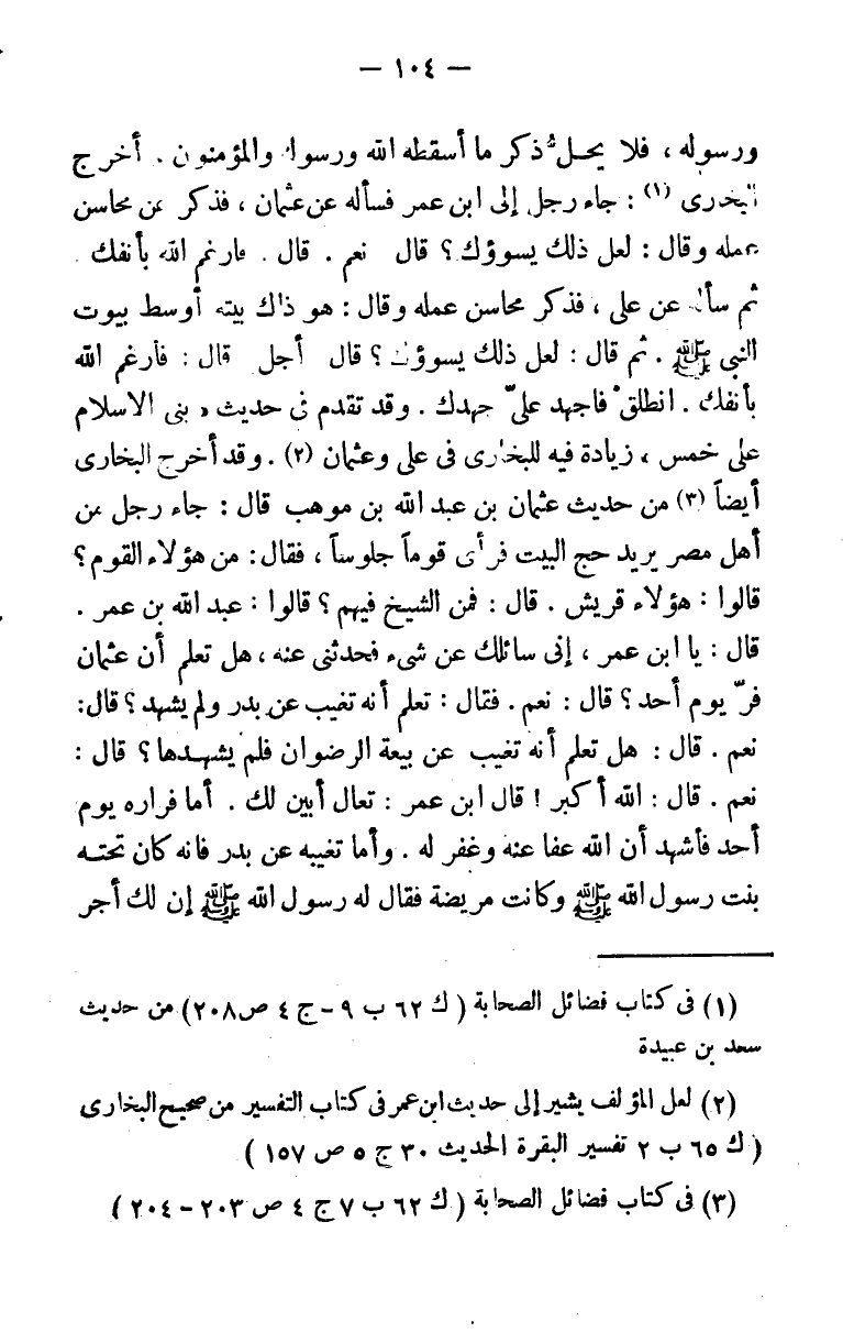 عنه ورسوله، فلا يحل ذكرُ ما أسقطه الله ورسوله والمؤمنون، أخرج البخاري (¬1) جاء رجل إلى ابن عمر فسأله عن عثمان، فذكر عن محاسن عمله وقال: لعل ذلك يسوؤك؟ قال: نعم. قال: فأرغم الله بأنفك! ثم سأله عن علي، فذكر محاسن عمله وقال: هو ذاك بيته أوسط بيوت النبي صلى الله عليه وسلم. ثم قال: لعل ذلك يسوؤك؟ قال: أجل. قال: فأرغم الله بأنفك! انطلق فاجهد عليّ جهدَك. وقد تقدم في حديث: «بُني الإسلام على خمس» زيادة فيه للبخاري في علي وعثمان (¬2) . وقد أخرج البخاري أيضا (¬3) من حديث عثمان بن عبد الله بن موهب قال: جاء رجل من أهل مصر يريد حج البيت، فرأى قوما جلوسا، فقال: من هؤلاء القوم؟ قالوا: هؤلاء قريش. قال: فمن الشيخ فيهم؟ قالوا: عبد الله بن عمر. قال: يا ابن عمر، إني سائلك عن شيء فحدثني عنه. هل تعلم أن عثمان فر يوم أحد؟ قال: نعم. فقال: تعلم أنه تغيب عن بدر ولم يشهد: قال؟ نعم. قال: هل تعلم أنه تغيب عن بيعة الرضوان فلم يشهدها؟ قال: نعم. قال: الله أكبر! قال ابن عمر، تعال أبين لك. أما فراره يوم أحد فأشهد أن الله عفا عنه وغفر له. وأما تغيبه عن بدر فإنه كان تحته بنت رسول الله صلى الله عليه وسلم وكانت مريضة فقال له رسول الله صلى الله
