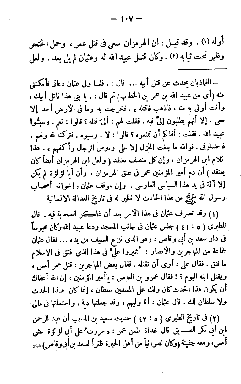 (¬1) وقد تصرف عثمان في هذا الأمر بعد أن ذاكر الصحابة فيه. قال الطبري (5: 41) جلس عثمان في جانب المسجد ودعا عبيد الله وكان محبوسا في دار سعد بن أبي وقاص، وهو الذي نزع السيف من يده. . . فقال عثمان لجماعة من المهاجرين والأنصار: أشيروا علي في هذا الذي فتق في الإسلام ما فتق. فقال علي: أرى أن تقتله. فقال بعض المهاجرين: قتل عمر أمس، ويقتل ابنه اليوم؟ فقال عمرو بن العاص: يا أمير المؤمنين، إن الله أعفاك أن يكون هذا الحدث كان ولك على المسلمين سلطان، إنما كان هذا الحدث ولا سلطان لك. قال عثمان: أنا وليهم، وقد جعلتها دية، واحتملتها في مالي.