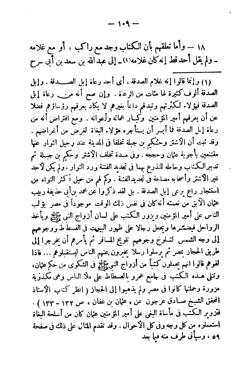 18 - وأما تعلقهم بأن الكتاب وجد مع راكب، أو مع غلامه - ولم يقل أحد قط إنه كان غلامه (¬1) - إلى عبد الله بن سعد بن أبي سرح يأمره بقتل