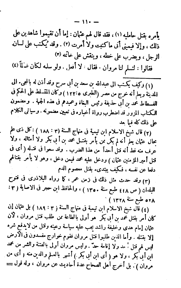 (¬2) قال شيخ الإسلام ابن تيمية في منهاج السنة (3: 188) : كل ذي علم بحال عثمان يعلم أنه لم يكن ممن يأمر بقتل محمد بن أبي بكر ولا أمثاله، ولا عرف منه قط أنه قتل أحدا من هذا الضرب. وقد سعوا في قتله (أي في قتل أمير المؤمنين عثمان) ودخل عليه محمد فيمن دخل، وهو لا يأمر بقتالهم دفعا عن نفسه، فكيف يبتدئ بقتل معصوم الدم.