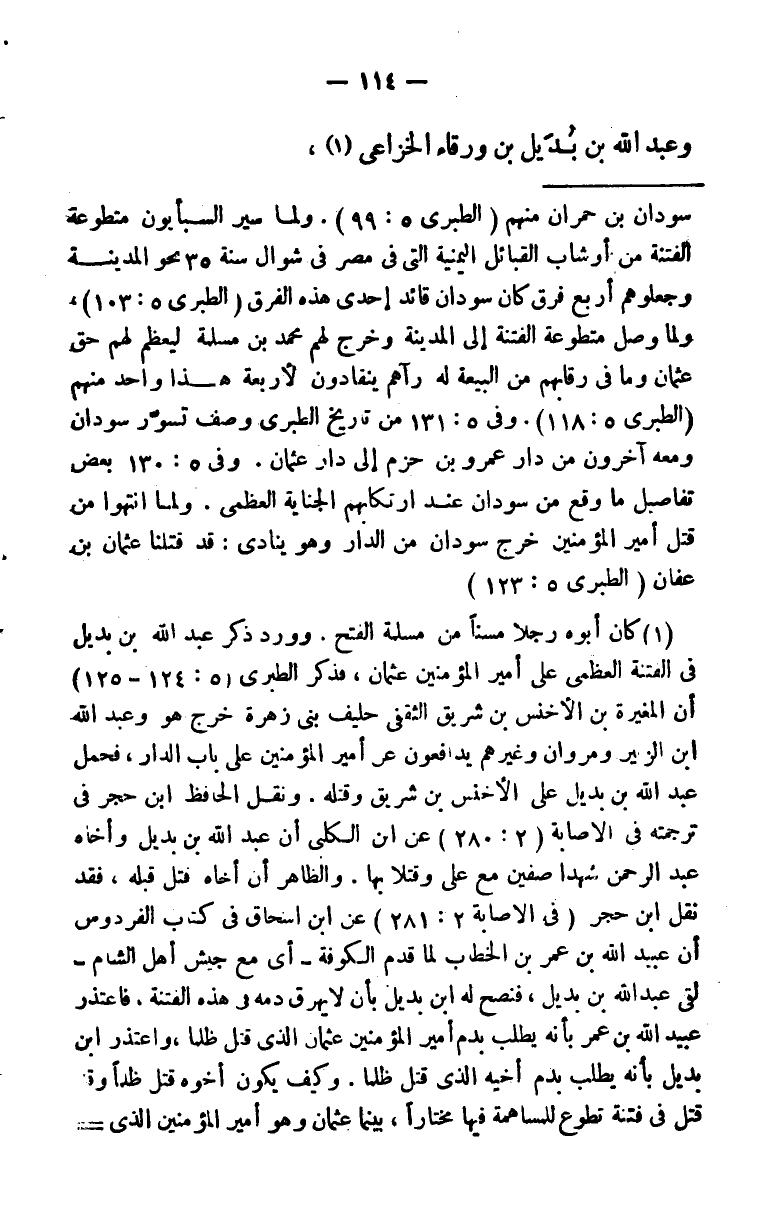 (¬1) كان أبوه رجلا مسنا من مسلمة الفتح. وورد ذكر عبد الله بن بديل في الفتنة العظمى على أمير المؤمنين عثمان، فذكر الطبري (5: 124 - 125) أن المغيرة بن الأخنس بن شريق الثقفي حليف بني زهرة خرج هو وعبد الله بن الزبير ومروان وغيرهم يدافعون عن أمير المؤمنين على باب الدار، فحمل عبد الله بن بديل على الأخنس بن شريق وقتله. ونقل الحافظ ابن حجر في ترجمته في الإصابة (2: 280) عن ابن الكلبي أن عبد الله بن بديل وأخاه عبد الرحمن شهدا صفين مع علي وقتلا بها. والظاهر أن أخاه قتل قبله، فقد نقل ابن حجر (في الإصابة 2: 281) عن ابن إسحاق في كتاب الفردوس أن عبيد الله بن عمر بن الخطاب لما قدم الكوفة - أي مع جيش أهل الشام - لقي عبد الله بن بديل، فنصح له ابن بديل بأن لا يهرق دمه في هذه الفتنة، فاعتذر عبيد الله بن عمر بأنه يطلب بدم أمير المؤمنين عثمان الذي قتل ظلما. واعتذر ابن بديل بأنه يطلب بدم أخيه الذي قتل ظلما. وكيف يكون أخوه قتل ظلما وقد قتل في فتنة تطوع للمساهمة فيها مختارا، بينما عثمان وهو أمير المؤمنين الذي له حق الولاية عليهم كان مبغيا عليه من ابن بديل وأمثاله ومن هم أقل منه شأنا، ومع ذلك لم يقاتل أحدا، ولم يدافع عن نفسه، ونهى الناس أن يدافعوا عنه أوباشا قدموا إلى مدينة الرسول صلى الله عليه وسلم من مختلف البلاد ليرتكبوا الشر والإثم. وأين عثمان الذي ملأت حسناته الأرض وتعطرت بأريجها السماء من عبد الرحمن بن بديل الذي لا يكاد يعرف له التاريخ عملا.