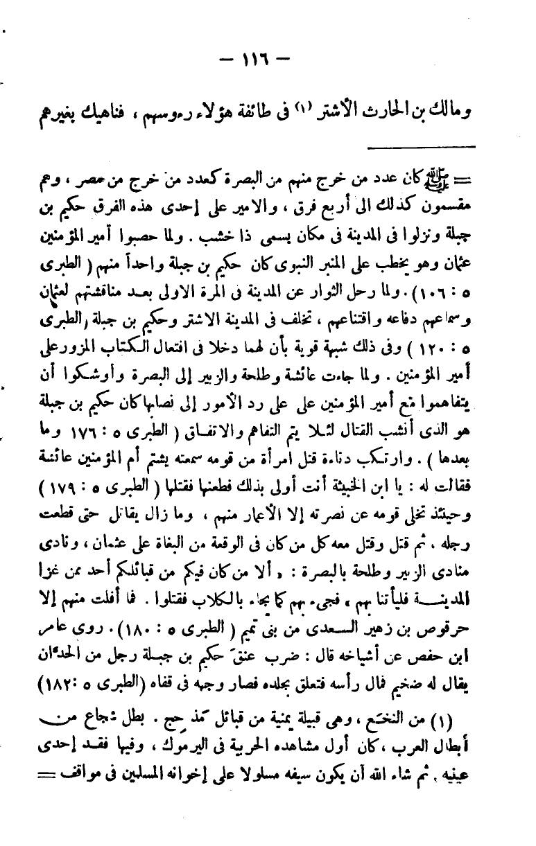 (¬1) من النخَع، وهي قبيلة يمنية من قبائل مَذْحج، بطل شجاع من أبطال العرب، كان أول مشاهده الحربية في اليرموك، وفيها فقد إحدى عينيه، ثم شاء الله أن يكون سيفه مسلولا على إخوانه المسلمين في مواقف الفتنة. ولو أنه لم يكن ممن ألب على أمير المؤمنين عثمان، وكتب الله أن تكون وقائعه الحربية في نشر دعوة الإسلام وتوسيع الفتوح، لكان له في التاريخ شأن آخر. والذي دفعه في هذا الطريق غلوه في الدين وحبه للرئاسة والجاه، ولست أدري كيف اجتمعتا فيه. والأشتر أحد الذين اتخذوا الكوفة دار إقامة لهم، فلما كانت إمارة الوليد بن عقبة على الكوفة كان الأشتر يشعر في نفسه بأنه أهل للولاية والرئاسة، فانزلق مع العائبين على الدولة ورجالها، من الخليفة الأعلى في المدينة إلى عامله على الكوفة الوليد بن عقبة. ولما سرق أبو زينب وأبو مورع خاتم الوليد من منزله وذهبا به إلى المدينة فشهدا على الوليد بشرب الخمر كما تقدم في ص96 أسرع الأشتر وآخرون معه بالذهاب إلى المدينة لتوسيع دائرة الفتنة، حتى إذا عزل عثمان الوليد بسعيد بن العاص عاد الأشتر مع سعيد إلى الكوفة، (الطبري 5: 63) . وكان عثمان قد سن نظام مبادلة الأراضي، فمن كانت له أرض من الفيء في مكان بعيد عنه يبادل عليها بأرض قريبة منه بالتراضي بين المتبادلين. وبهذه الطريقة تخلى طلحة بن عبيد الله عن أسهمه في خيبر واشترى بها من فيء أهل المدينة بالعراق أرضا يقال لها النشاستج (الطبري 5: 64) . وبينما كان سعيد بن العاص في دار الإمارة بالكوفة والناس عنده أثنى رجل على طلحة بن عبيد الله بالجود، فقال سعيد بن العاص: لو كان لي مثل أرض النشاستج لأعاشكم الله عيشا رغدا. فقال له عبد الرحمن بن خنيس الأسدي: وودت لو كان هذا الملطاط لك. والملطاط أرض على جانب الفرات كانت لآل كسرى. فغضب الأشتر وأصحابه وقالوا للأسدي: تتمنى له من سوادنا؟ فقال والده: ويتمنى لكم أضعافه. فثار الأشتر وصحبه على الأسدي وأبيه وضربوهما في مجلس الإمارة حتى غشي عليهما. وسمعت بذلك بنو أسد فجاءوا وأحاطوا بالقصر ليدافعوا عن رجليهما، فتلافى سعيد بن العاص هذه الفتنة بحكمته، ورد بني أسد عن الأشتر وجماعته. وكتب أشراف الكوفة وصلحاؤها إلى عثمان في إخراج هؤلاء المشاغبين من بلدهم، فأرسلهم إلى معاوية في الشام (الطبري 5: 85 - 86) ثم أخرجهم معاوية فنزلوا جزيرة ابن عمر تحت حكم عبد الرحمن بن خالد بن الوليد، إلى أن تظاهروا بالتوبة، فذهب الأشتر إلى المدينة ليرفع إلى عثمان توبتهم، فرضي عنه عثمان وأباح له الذهاب حيث شاء، فاختار العودة إلى زملائه الذين عند عبد الرحمن بن خالد بن الوليد في الجزيرة (الطبري 5: 87 - 88) . وفي الوقت الذي كان فيه الأشتر يعرض على عثمان توبته وتوبة زملائه وذلك في سنة 34 كان السبئيون في مصر يكاتبون أشياعهم في الكوفة والبصرة بأن يثوروا على أمرائهم واتعدوا يوما، فلم يستقم ذلك إلا لجماعة الكوفة، فثار بهم يزيد بن قيس الأرحبي (الطبري 5: 101) . ولما وصل الأشتر من المدينة إلى إخوانه الذين عند عبد الرحمن بن خالد بن الوليد وجد بين أيديهم كتابا من يزيد بن قيس الأرحبي يقول لهم فيه: لا تضعوا كتابي من أيديكم حتى تجيئوا. فتشاءموا من هذه الدعوة وآثروا البقاء، وخالفهم الأشتر فرجع عاصيا بعد توبته، والتحق بثوار الكوفة وقد نزلوا في الجرعة - مكان مشرف على القادسية - وهناك تلقوا سعيد بن العاص أميرا على الكوفة وهو عائد من المدينة فردوه، ولقي الأشتر مولى لسعيد بن العاص فضرب الأشتر عنقه. وبلغ عثمان أنهم يريدون إقالة سعيد بأبي موسى الأشعري فأجابهم إلى ما طلبوا (الطبري 5: 93 - 94) . ولما فشل موعد سنة 34 واقتصرت الفتنة على ما كان في الجرعة، اتعد السبئيون للسنة التي بعدها (سنة 35) ورتبوا أمرهم على التوجه إلى المدينة مع الحجاج كالحجاج، وكان الأشتر مع خوارج الكوفة رئيسا على فرقة من فرقهم الأربع (الطبري 5: 104) . وبعد وصولهم إلى المدينة ناقشهم أمير المؤمنين عثمان وبين لهم حجته في كل ما كانوا يظنونه فيه، فاقتنع جمهورهم بذلك وحملوا رؤساء الفتنة على الرضا بأجوبة عثمان وارتحلوا من 