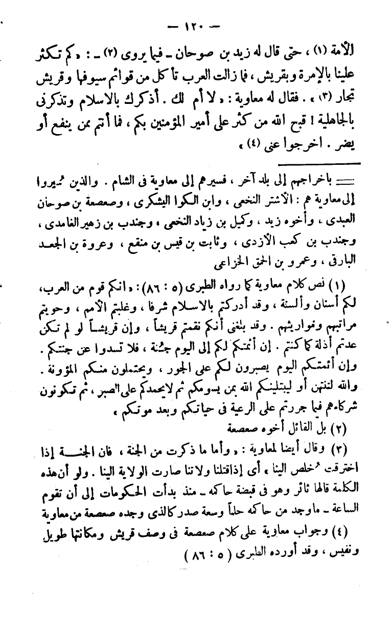 (¬1) نص كلام معاوية كما رواه الطبري (5: 86) : " إنكم قوم من العرب، لكم أسنان وألسنة، وقد أدركتم بالإسلام شرفا، وغلبتم الأمم، حويتم مراتبهم ومواريثهم. وقد بلغني أنكم نقمتم قريشا، وإن قريشا لو لم تكن عدتم أذلة كما كنتم. إن أئمتكم لكم إلى اليوم جنة، فلا تسدوا عن جنتكم. وإن أئمتكم اليوم يصبرون لكم على الجور، ويحتملون منكم المؤونة، والله لتنتهن أو ليبتلينكم الله بمن يسومكم ثم لا يحمدكم على الصبر، ثم تكونون شركاءهم فيما جررتم على الرعية في حياتكم وبعد موتكم ".