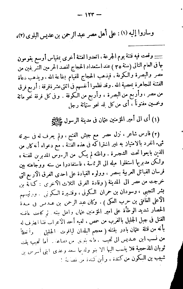 (¬2) فارس شاعر، نزل مصر مع جيش الفتح، ولم يعرف له في سيرته شيء انفراد بالامتياز به غير اشتراكه في هذه الفتنة، مع دعواه أنه كان من الذين بايعوا تحت الشجرة. وأظنه لم يكن من الرءوس المدبرين للفتنة، ولكن مدبريها استغلوا ميله إلى الرئاسة، فاستفادوا من سنه ووجاهته بين فرسان القبائل العربية بمصر، وولوه القيادة على إحدى الفرق الأربع التي خرجت من مصر إلى المدينة (وقادة الفرق الثلاث الأخرى: كنانة بن بشر التجيبي، وسودان بن حمران السكوني، وقتيرة السكوني. ورئيسهم الأعلى الغافقي بن حرب العكي) . وكان عبد الرحمن بن عديس في مدة الحصار شديد الوطأة على أمير المؤمنين عثمان وأهل بيته. ثم كانت عاقبته القتل في جبل الجليل بالقرب من حمص، لقيه أحد الأعراب، فلما اعترف له أنه من قتلة عثمان بادر بقتله (معجم البلدان لياقوت: الجليل) . وأخطأ من نسب ابن عديس إلى تجيب، فإنه بلوي من قضاعة. أما تجيب بنت ثوبان المذحجية فلا ينسب إليها إلا بنو ولديها سعد وعدي بن أشرس بن شبيب بن السكون من كندة، وأين كندة من قضاعة! .