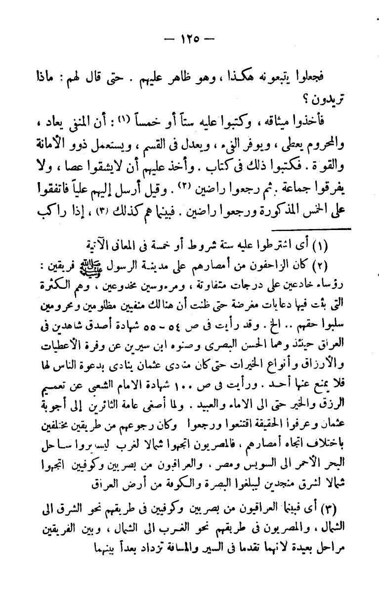 (¬2) كان الزاحفون من أمصارهم على مدينة الرسول صلى الله عليه وسلم فريقين: رؤساء خادعين على درجات متفاوتة، ومرءوسين مخدوعين، وهم الكثرة التي بثت فيها دعايات مغرضة حتى ظنت أن هنالك منفيين مظلومين ومحرومين سلبوا حقهم. . . الخ. وقد رأيت في ص54ـ 55 شهادة أصدق شاهدين في العراق حينئذ وهما الحسن البصري وصنوه ابن سيرين عن وفرة الأعطيات والأرزاق وأنواع الخيرات. حتى كان منادي عثمان ينادي بدعوة الناس لها فلا يمنع عنها أحد. ورأيت في ص100 شهادة الإمام الشعبي عن تعميم الرزق والخير حتى إلى الإماء والعبيد. ولما أصغى عامة الثائرين إلى أجوبة عثمان وعرفوا الحقيقة اقتنعوا ورجعوا، وكان رجوعهم من طريقين مختلفين باختلاف اتجاه أمصارهم فالمصريين اتجهوا شمالا لغرب ليسايروا ساحل البحر الأحمر إلى السويس ومصر، والعراقيون من بصريين وكوفيين اتجهوا شمالا لشرق منجدين ليبلغوا البصرة والكوفة من أرض العراق.