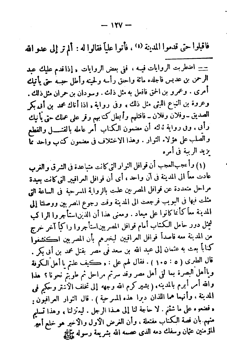 (¬1) وأعجب العجب أن قوافل الثوار العراقيين التي كانت متباعدة في الشرق عن قوافل الثوار المصريين في الغرب عادتا معًا إلى المدينة في آن واحد، أي أن قوافل العراقيين التي كانت بعيدة مراحل متعددة عن قوافل المصريين ولا علم لها بالرواية المسرحية التي مثلت في البويب رجعت إلى المدينة من الشرق وقت رجوع المصريين من الغرب ووصلتا إلى المدينة معًا كأنما كانوا على ميعاد! ومعنى هذا أن اللذين استأجروا الراكب ليمثل دور حامل الكتاب أمام قوافل المصريين استأجروا راكبًا آخر خرج من المدينة معه قاصدًا قوافل العراقيين ليخبرهم بأن المصريين اكتشفوا كتابًا بعث به عثمان إلى عبد الله بن سعد في مصر بقتل محمد بن أبي بكر. قال الطبري (5: 105) : فقال لهم علي: ((كيف علمتم يا أهل الكوفة ويا أهل البصرة بما لقي أهل مصر، وقد سرتم مراحل ثم طويتم نحونا؟ هذا والله أمر أبرم بالمدينة!)) (يشير كرم الله وجهه إلى تخلف الأشتر وحكيم في المدينة، وأنهما هما اللذان دبرا هذه المسرحية. قال الثوار العراقيون بلسان رؤسائهم: ((فضعوه على ما شئتم. لا حاجة لنا إلى هذا الرجل. ليعتزلنا)) وهذا تسليم منهم بأن قصة الكتاب مفتعلة، وأن الغرض الأول والأخير هو خلع أمير المؤمنين عثمان وسفك دمه الذي عصمه الله بشريعة رسوله صلى الله عليه وسلم.