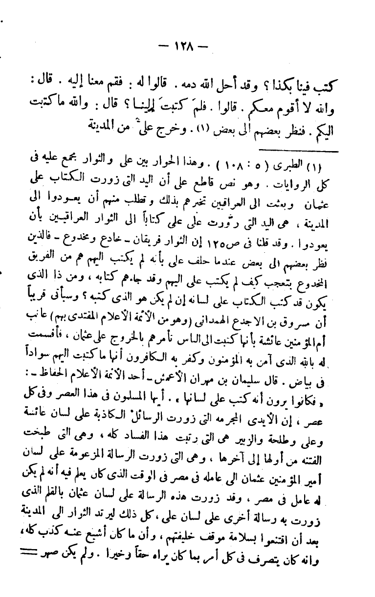(¬1) الطبري (5: 108) . وهذا الحوار بين علي والثوار مجمع عليه في كل الروايات وهو نص قاطع على أن اليد التي زورت الكتاب على عثمان وبعثت إلى العراقيين تخبرهم بذلك وتطلب منهم أن يعودوا إلى المدينة، هي اليد التي زورت على علي كتابًا إلى الثوار العراقيين بأن يعودوا. وقد قلنا في ص 125 أن الثوار فريقان - خادع ومخدوع - فالذين نظر بعضهم إلى بعض عندما حلف علي بأنه لم يكتب إليهم هم من الفريق المخدوع يتعجب كيف لم يكتب علي إليهم وقد جاءهم كتابه. ومن ذا الذي يكون قد كتب الكتاب على لسانه إذا لم يكن هو الذي كتبه؟ وسيأتي في ص 136 أن مسروق بن الأجدع الهمداني - وهو من الأئمة الأعلام المقتدى بهم - عاتب أم المؤمنين عائشة بأنها كتبت إلى الناس تأمرهم بالخروج على عثمان، فأقسمت له بالذي آمن به المؤمنون وكفر به الكافرون أنها ما كتبت إليهم سوادًا في بياض. قال سليمان بن مهران الأعمش - أحد الأئمة الأعلام الحفاظ -: ((فكانوا يرون أنه كتب على لسانها)) . أيها المسلمون في هذا العصر وفي كل عصر، إن الأيدي المجرمة التي زورت الرسائل الكاذبة على لسان عائشة وعلي وطلحة والزبير هي التي رتبت هذا الفساد كله، وهي التي طبخت الفتنة من أولها إلى آخرها، وهي التي زورت الرسالة المزعومة على لسان أمير المؤمنين عثمان إلى عامله في مصر في الوقت الذي كان يعلم فيه أنه لم يكن له عامل في مصر، وقد زورت هذه الرسالة على لسان عثمان بالقلم الذي زورت به رسالة أخرى على لسان علي، كل ذلك ليرتد الثوار إلى المدينة بعد أن اقتنعوا بسلامة موقف خليفتهم، وأن ما كان قد أشيع عنه كذب كله، وأنه كان يتصرف في كل أمر بما كان يراه حقًا وخيرًا.