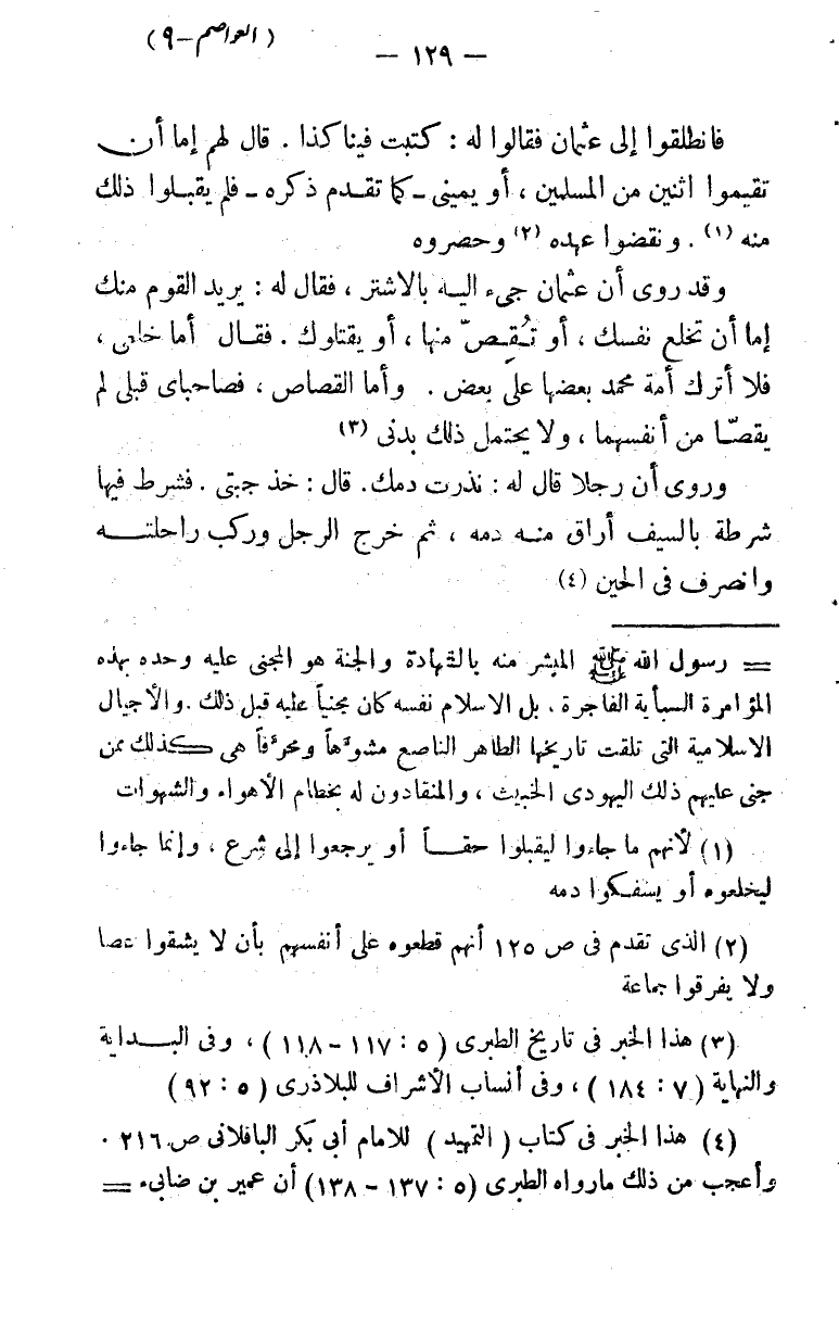 (¬4) هذا الخبر في كتاب (التمهيد) للإمام أبي بكر الباقلاني ص 216. وأعجب من ذلك ما رواه الطبري (5: 137 - 138) أن عمير بن ضابئ البرجمي وكميل بن زياد النخعي حضرا إلى المدينة ليغتالا عثمان تنفيذا لقرار اتخذوه في الكوفة مع بقية عصابتهم، فلما وصلا إلى المدينة نكل عمير، وترصد كميل للخليفة حتى مر به، فلما التقيا ارتاب منه عثمان، ووجأ وجهه فوقع على استه، فقال لعثمان: أوجعتنى يا أمير المؤمنين، قال عثمان: أولست بفاتك؟! قال: لا والله الذي لا إله إلا هو. فاجتمع الناس وقالوا: نفتشه يا أمير المؤمنين فقال: لا. قد رزق الله العافية، ولا أشتهي أن أطلع منه على غير ما قال. ثم قال لكميل: ((إن كان كما قلت فاقتد مني (وجثَا) فوالله ما حسبتك إلا تريدني)) وقال: ((إن كنت صادقًا فأجزل الله، وإن كنت كاذبًا فأذل الله)) وقعد له على قدميه وقال ((دونك!)) فقال كميل: ((تركت)) . أيها القارئ الكريم، إن هذا الموقف ليس موقف خليفة فضلًا عمن دونه، بل هو موقف المتخلقين بأخلاق الأنبياء. على أن الله يمهل ولا يهمل. فقد جاء الحجاج بعد أربعين سنة فقتل ضابئًا وقتل كميلا بما أراداه في هذا الحادث من الفتك برجل خلق قلبه من رحمة الله، و (إن الله ليملي للظالم، حتى إذا أخذه لم يفلته) .