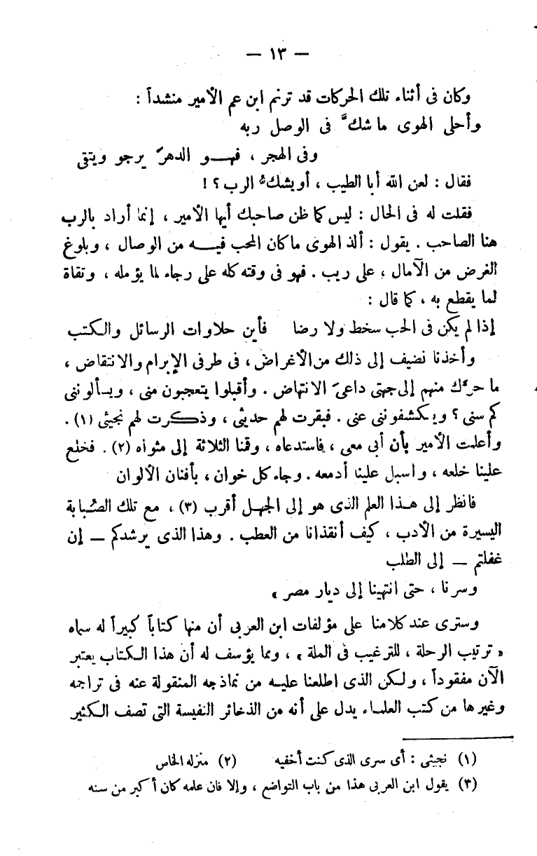 وسترى عند كلامنا على مؤلفات ابن العربي أن منها كتابا كبيرا سماه "ترتيب الرحلة، للترغيب في الملة" ومما يؤسف له أن هذا الكتاب يعتبر الآن مفقودا، ولكن الذي اطلعنا عليه من نماذجه المنقولة عنه في تراجمه وغيرها من كتب العلماء يدل على أنه من الذخائر النفيسة التي تصف الكثير من أحوال المجتمع الإسلامي وعمران أوطانه في النصف الثاني من القرن الخامس الهجري، وتنوه بدخائل أعلامه من العلماء والحكام بقدر ما اطلع عليه هذا العالم الرحالة الدقيق النظر الذكي الفطرة الحريص على الإلمام بجميع أبواب المعرفة، ولو وقع لنا كتاب رحلته، لانتفعنا منه كثيرا في تدوين ترجمته، ولا سيما في السنوات التسع (485 - 493) التي قضاها في خارج الأندلس، بين حادثة سقوط دولة آل عباد والوقت الذي شاء الله له أن يعود فيه إلى وطنه.