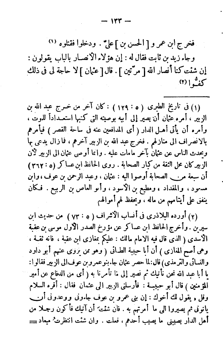 (¬1) في تاريخ الطبري (5: 129) : كان آخر من خرج عبد الله بن الزبير أمره عثمان أن يصير إلى أبيه بوصيته التي كتبها استعدادًا للموت، أمره أن يأتي أهل الدار (أي المدافعين عنه في ساحة القصر) فيأمرهم بالانصراف إلى منازلهم. فخرج عبد الله بن الزبير آخرهم، فما زال يدعى بها ويحدث الناس عن عثمان بآخر ما مات عليه، وإنما أوصى عثمان إلى الزبير لأن الزبير كان محل الثقة من كبار الصحابة. روى الحافظ ابن عساكر (5: 362) أن سبعة من الصحابة أوصوا به: عثمان وعبد الرحمن بن عوف، وابن مسعود، والمقداد، ومطيع بن الأسود، وأبو العاص بن الربيع، فكان ينفق على أيتامهم من ماله، ويحفظ لهم أموالهم.