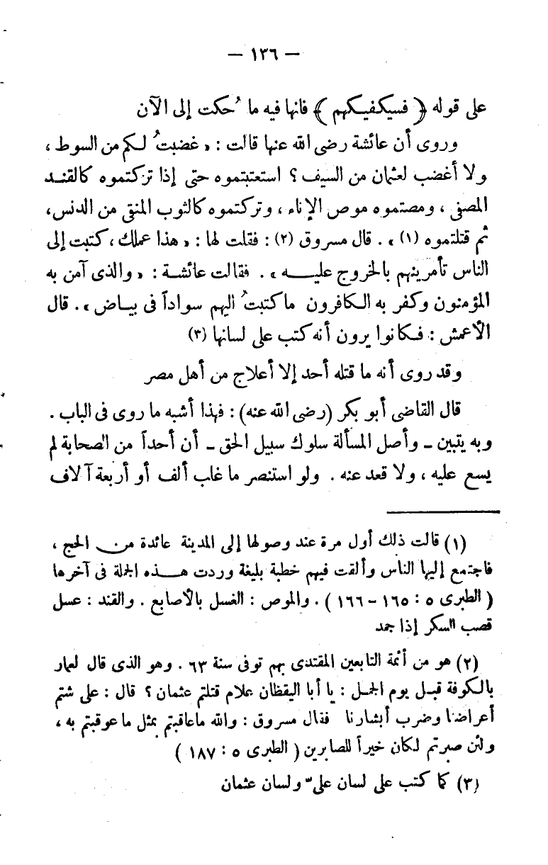 قال مسروق (¬2) فقلت لها: ((عملك، كتبت إلى الناس تأمرينهم بالخروج عليه)) . فقالت عائشة: ((والذي آمن به المؤمنون وكفر به الكافرون ما كتبت إليهم سوادًا في بياض)) . قال الأعمش: فكانوا يرون أنه كتب على لسانها (¬3) .