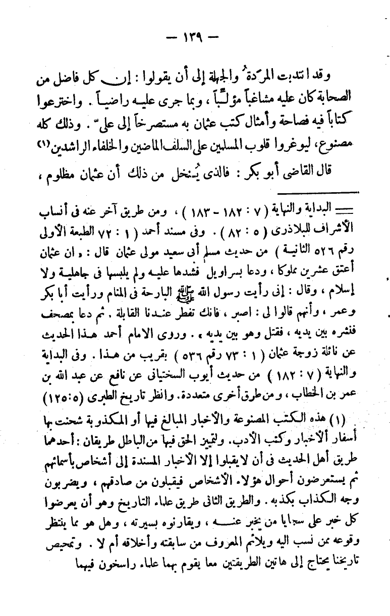 (¬1) هذه الكتب المصنوعة والأخبار المبالغ فيها أو المكذوبة شحنت بها أسفار الأخبار وكتب الأدب. ولتمييز الحق فيها من الباطل طريقان: أحدهما طريق أهل الحديث في ألا يقبلوا إلا الأخبار المسندة إلى أشخاص بأسمائهم ثم يستعرضون أحوال هؤلاء الأشخاص فيقبلون من صادقهم، ويضربون وجه الكذاب بكذبه. والطريق الثاني طريق علماء التاريخ وهو أن يعرضوا كل خبر على سجيا من يخبر عنه، ويقارنوه بسيرته، وهل هو ممن ينتظر وقوعه ممن نسب إليه ويلائم المعروف من سابقته وأخلاقه أم لا. وتمحيص تاريخنا يحتاج إلى هاتين الطريقتين معا يقوم بهما علماء راسخون فيهما.