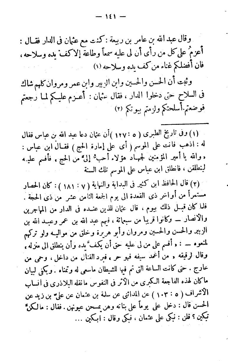 (¬1) وفي تاريخ الطبري (5: 127) أن عثمان دعا عبد الله بن عباس فقال له: اذهب فأنت على الموسم (أي على إمارة الحج) فقال ابن عباس: "والله يا أمير المؤمنين لجهاد هؤلاء أحب إلي من الحج". فأقسم عليه لينطلقن، فانطلق ابن عباس على الموسم تلك السنة.