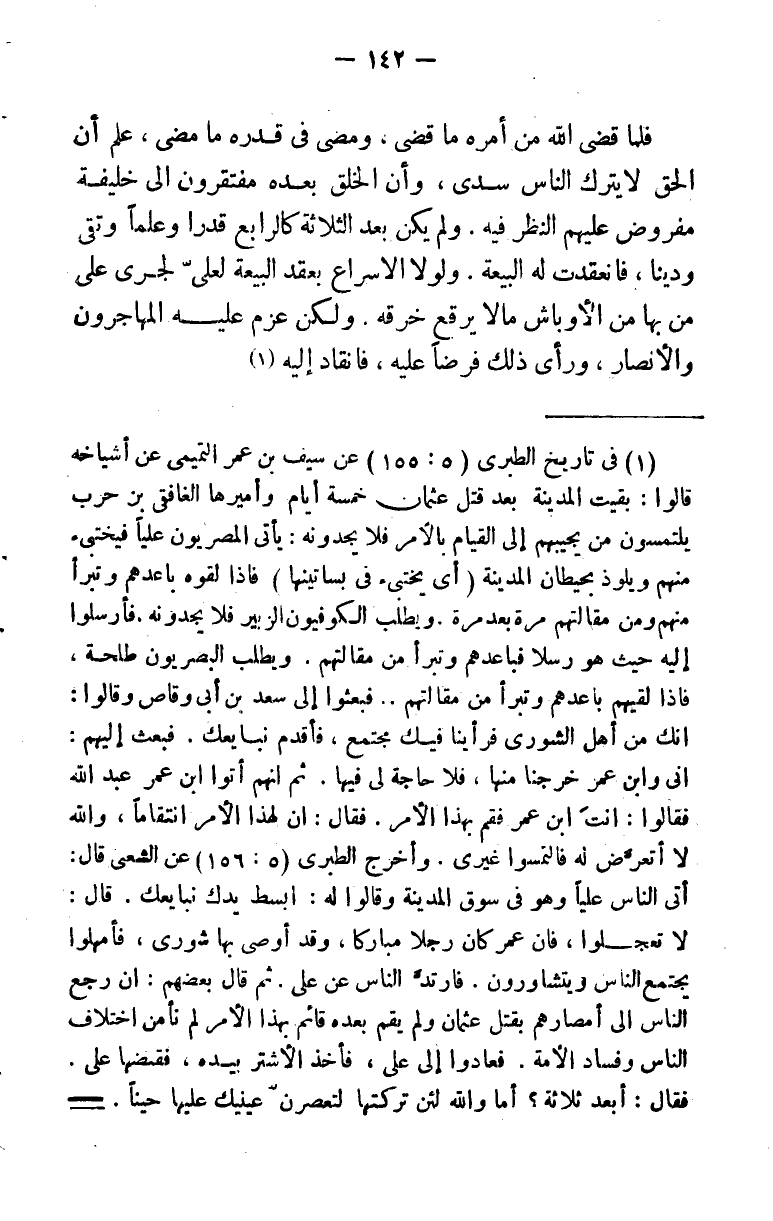 (¬1) في تاريخ الطبري (5: 155) عن سيف بن عمر التميمي عن أشياخه قالوا: بقيت المدينة بعد قتل عثمان خمسة أيام وأميرها الغافقي بن حرب يلتمسون من يجيبهم إلى القيام بالأمر فلا يجدونه: يأتي المصريون عليًّا فيختبئ منهم ويلوذ بحيطان المدينة (أي يختبئ في بساتينها) فإذا لقوه باعدهم وتبرأ من مقالتهم مرة بعد مرة. ويطلب الكوفيون الزبير فلا يجدونه. فأرسلوا إليه حيث هو رسلا فباعدهم وتبرأ من مقالتهم. . . فبعثوا إلى سعد بن أبي وقاص وقالوا: إنك من أهل الشورى فرأينا فيك مجتمع. فأقدم نبايعك. فبعث إليهم: وإني وابن عمر خرجنا منها، فلا حاجة لي فيها. ثم إنهم أتوا ابن عمر عبد الله فقالوا: أنت ابن عمر فقم بهذا الأمر. فقال: إن لهذا الأمر انتقامًا، والله لا أتعرض له فالتمسوا غيري. وأخرج الطبري (5: 156) عن الشعبي قال: أتى الناس عليًّا وهو في سوق المدينة وقالوا له: ابسط يدك نبايعك. قال: لا تعجلوا، فإن عمر كان رجلًا مباركًا، وقد أوصى بها شورى، فأمهلوا يجتمع الناس ويتشاورون. فارتد الناس عن علي. ثم قال بعضهم: إن رجع الناس إلى أمصارهم بقتل عثمان ولم يقم بعده قائم بهذا الأمر لم نأمن اختلاف الناس وفساد الأمة. فعادوا إلى علي، فأخذ الأشتر بيده، فقبضها علي. فقال: أبعد ثلاثة؟ أما والله لئن تركتها لتعصرن عينيك عليها حينًا. فبايعته العامة. وأهل الكوفة يقولون: أول من بايعه الأشتر. وروى سيف عن أبي حارثة محرز العبشمي وعن أبي عثمان يزيد بن أسيد الغساني قالا: لما كان يوم الخميس -على رأس خمسة أيام من مقتل عثمان- جمعوا أهل المدينة، فوجدوا سعدا والزبير خارجين ووجدوا طلحة في حائط له. . . فلما اجتمع لهم أهل المدينة قال لهم أهل مصر: أنتم أهل الشورى وأنتم تعقدون الإمامة وأمركم عابر على الأمة، فانظروا رجلًا تنصبونه ونحن لكم تبع. فقال الجمهور: علي بن أبي طالب نحن به راضون. . . فقال علي: دعوني والتمسوا غيري. . . فقالوا: ننشدك الله، ألا ترى الفتنة، ألا تخاف الله؟ فقال: إن أجبتكم ركبت بكم ما أعلم، وإن تركتموني، فإنما أنا كأحدكم، إلا أني أسمعكم وأطوعكم لمن وليتموه أمركم، ثم افترقوا على ذلك واتعدوا الغد (أي يوم الجمعة) : فلما أصبحوا من يوم الجمعة حضر الناس المسجد، جاء علي حتى صعد المنبر فقال: ((يا أيها الناس عن ملأ وأذن. إن هذا أمركم، ليس لأحد فيه حق إلا أن أمرتم. وقد افترقنا بالأمس على أمر. فإن شئتم قعدت لكم وإلا فلا أجد على أحد)) فقالوا ((نحن على ما فارقناك عليه بالأمس)) . وهذه الوقائع على بساطتها تدل على أن بيعة علي كانت كبيعة إخوانه من قبل جاءت على قدرها وفي إبانها، وأنها مستمدة من رضا الأمة في حينها، لا من وصية سابقة مزعومة، أو رموز خيالية موهومة.