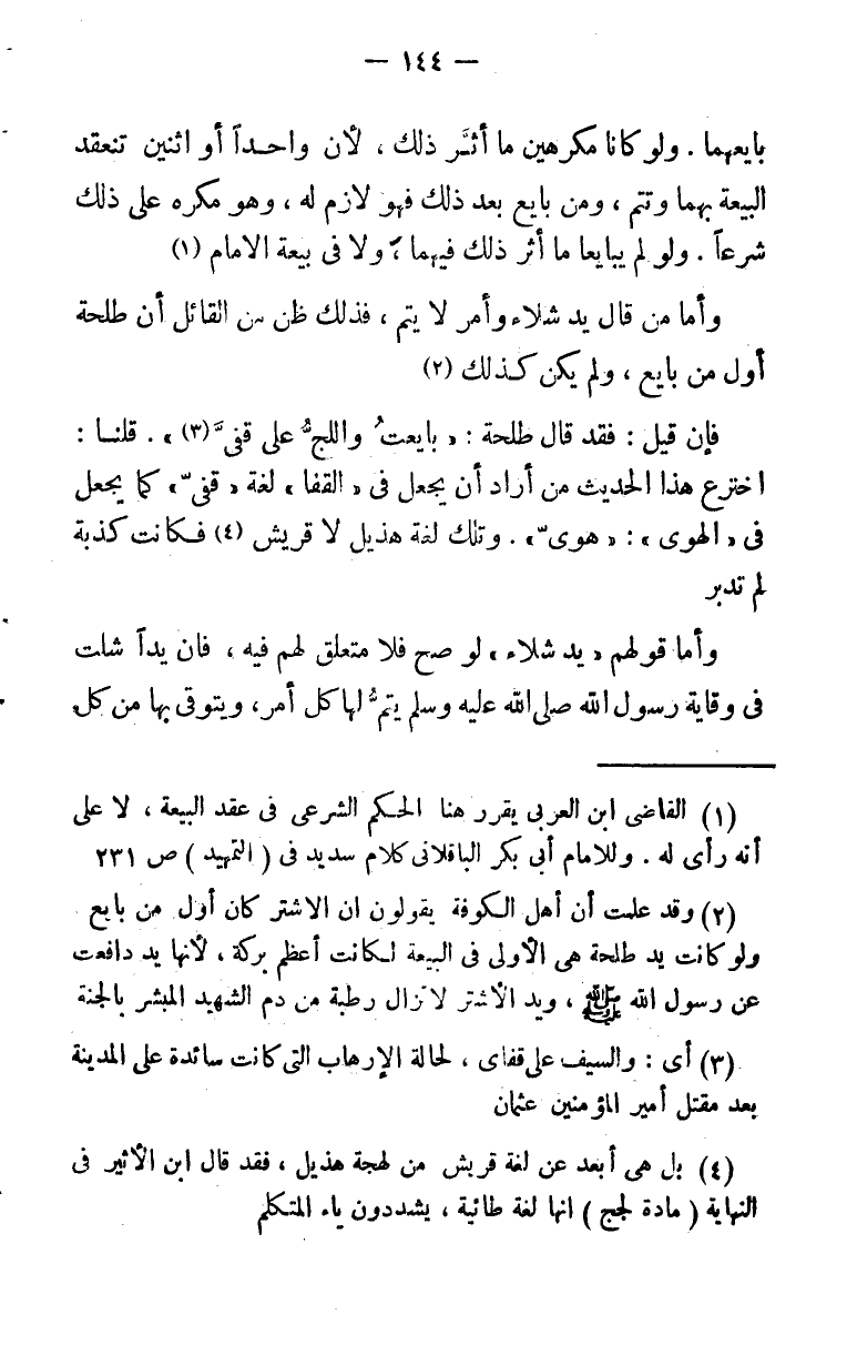 (¬2) وقد علمت أن أهل الكوفة يقولون إن الأشتر كان أول من بايع. ولو كانت يد طلحة هي الأولى في البيعة لكانت أعظم بركة، لأنها يد دافعت عن رسول الله صلى الله عليه وسلم، ويد الأشتر لا تزال رطبة من دم إمامه الشهيد المبشر بالجنة.