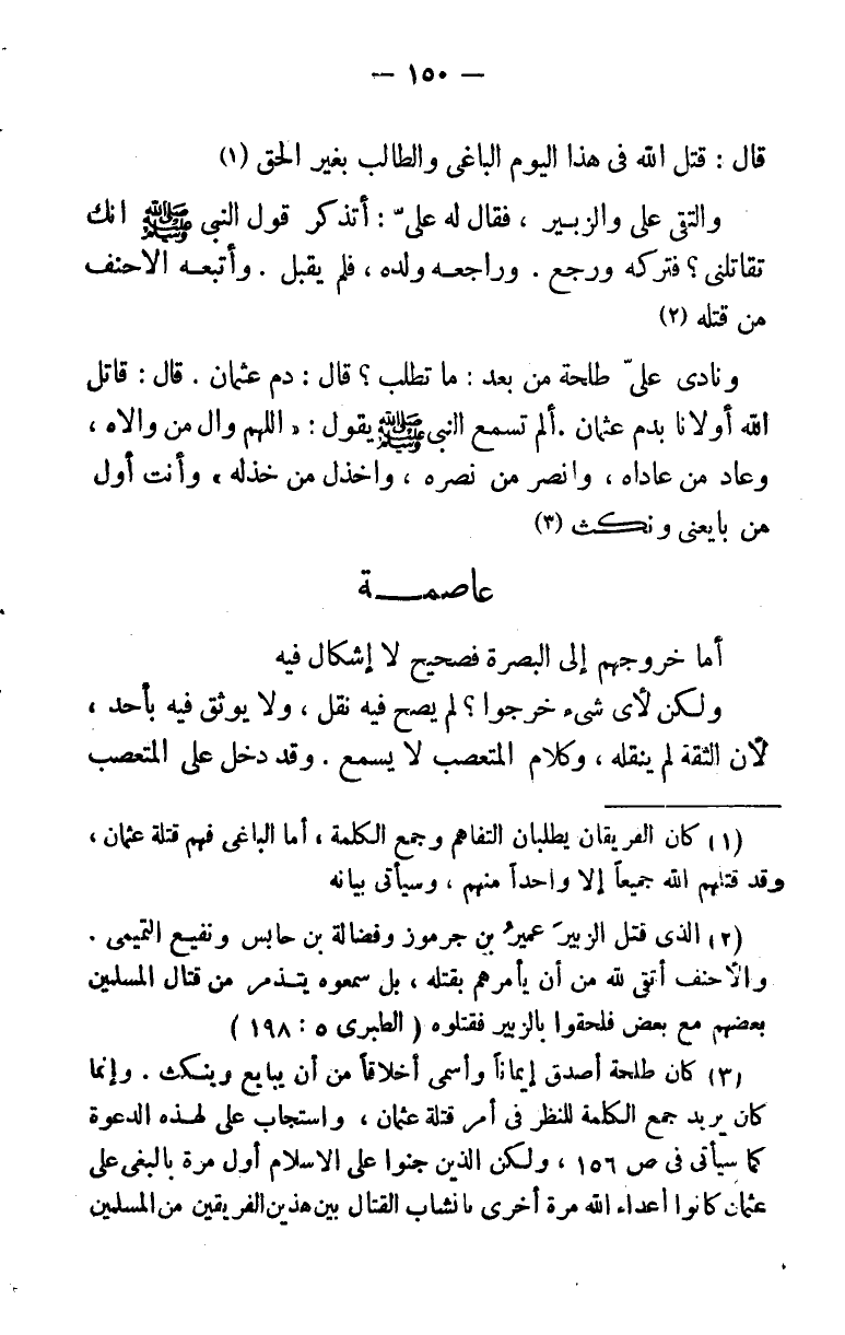 (¬3) كان طلحة أصدق إيمانا وأسمى أخلاقا من أن يبايع وينكث. وإنما كان يريد جمع الكلمة للنظر في أمر قتلة عثمان، استجاب علي لهذه الدعوة كما سيأتي ص 156، ولكن الذين جنوا على الإسلام أول مرة بالبغي على عثمان كانوا أعداء الله مرة أخرى بإنشاب القتال بين هذين الفريقين من المسلمين.